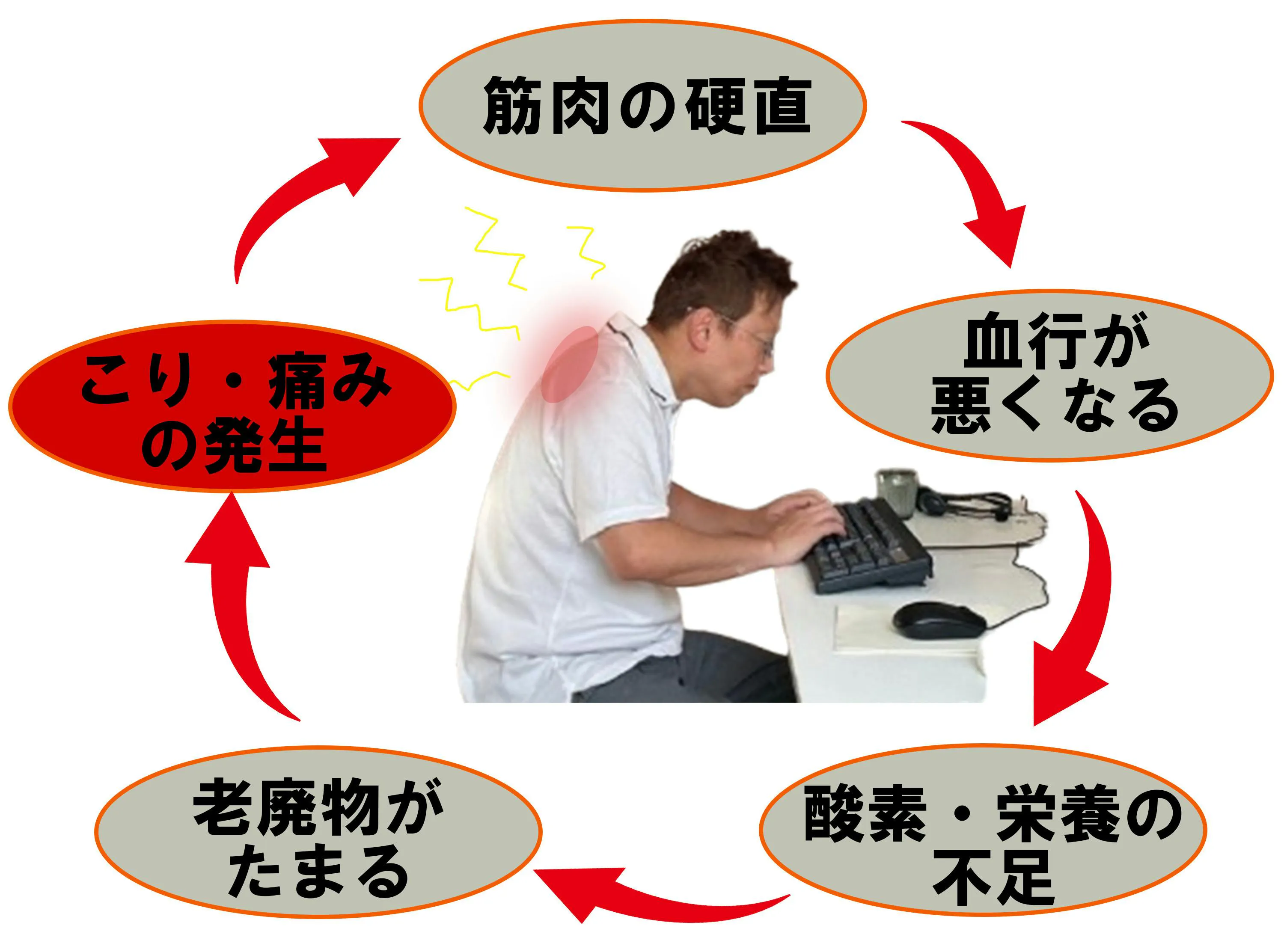 長時間のパソコン作業等で同じ姿勢を続けると、筋肉が緊張し、硬くなり、血管を圧迫し、血液の循環が悪くなるようです。