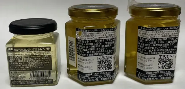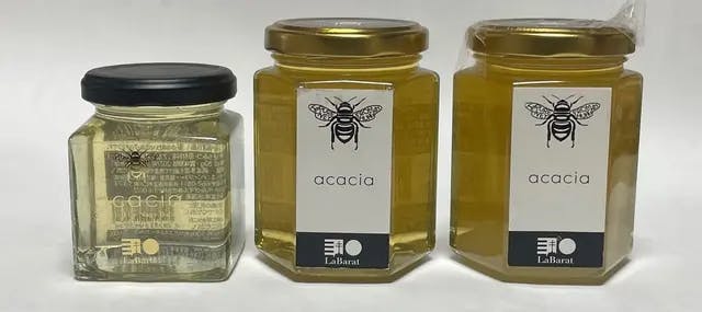 上の3枚の写真は、右側が2024年3月末賞味期限の初輸入時のアカシアハチミツ、真ん中が2024年9月末賞味期限のアカシアハチミツ、そして左側が今回の新商品です。撮影は昨年の10月ごろです。