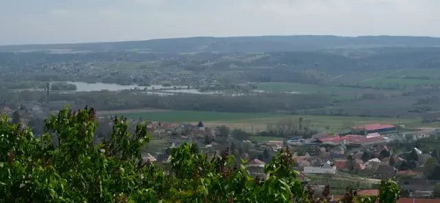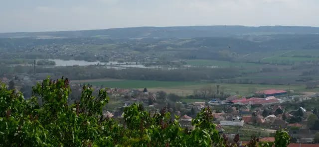 この写真は、Nagyさんが住む町・パンノンハルマの中心部、世界文化遺産の大修道院がある高台からの眺めです。池の向こうに広がるのがNagyさんが採蜜する広大なアカシア林です。
