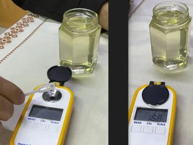 日本では蜜ろうで蓋がされたハチミツを「完熟ハチミツ」と言っていますが、Nagyさんはミツバチの気分を察して巣箱をたたいたり、ハチミツをなめたりして、水分量を確認。最終的には先の写真のように計器でチェックして「16~17%」の水分量のハチミツを出荷しています。