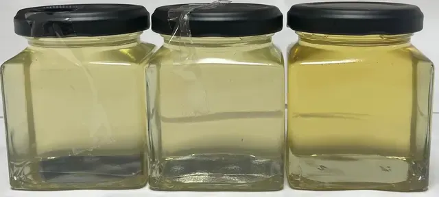 左側の2つが新しいアカシアハチミツ、右側が期限切れハチミツを入れた瓶です。明らかに色目が違います。