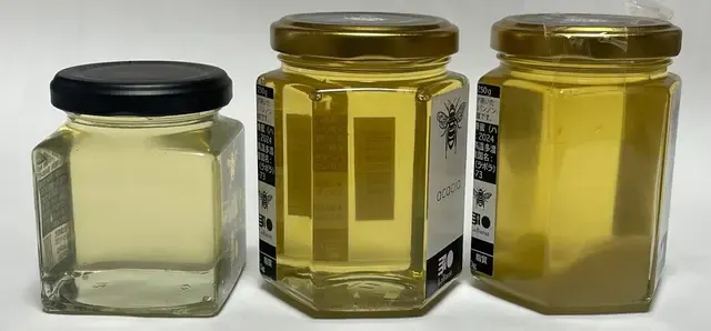 右側の3月末賞味期限のアカシアハチミツはすでに瓶詰めから2年半以上経過していますが、色目は真ん中のものとほぼ変わりありません。明確な違いは、少し結晶化が進んでいることくらいでしょう。