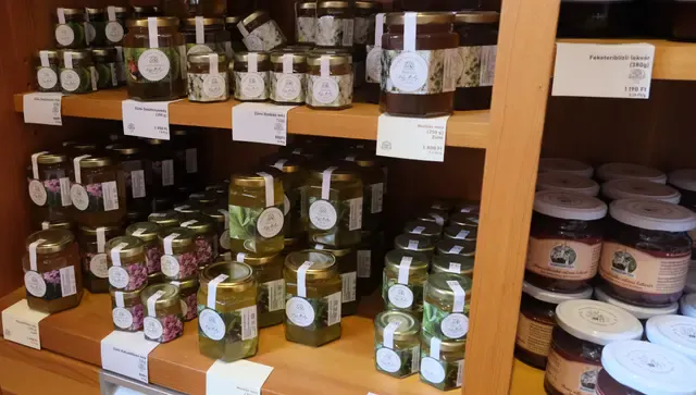 土産物にはハチミツもあります。大修道院ではハチミツを作っていないので、周辺の養蜂家のハチミツが売られています。品質にこだわるNagyさんのハチミツは大修道院の評価も高く、多くのハチミツが売られていました。左の棚のハチミツがすべてNagyさんのハチミツです。
