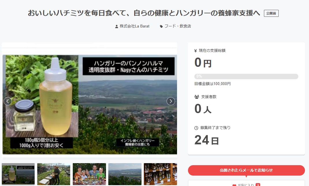 今日午前7時に公開し、さきほど初めての支援をいただきました。ご支援していただけました方、誠にありがとうございます。Nagyさんのアカシアハチミツは天然完熟はもちろん、水分量にもこだわった特別なアカシアハチミツです。最初に口に入れた時は水飴のように思うかと思いますが、じわっとハチミツのおいしさが広がります。「このハチミツがいい」だけではなく、「このハチミツでないといや」とも思っていただけるのではないかと思います。ぜひ、引き続きのご支援をよろしくお願い致します。