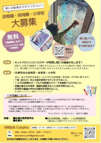 現在は、札幌市内を中心に幼稚園・保育園・小学校を無料で回って窓にお絵描きアートを体験してもらっています。2024年11月から始まった活動で、現在7カ所。1年間で50カ所訪問したいと考えています。