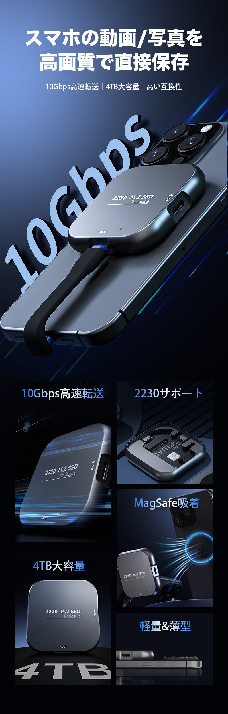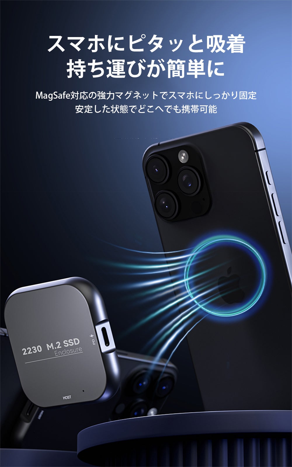 本製品はMagSafe対応しているため、スマホに吸着できて持ち運びが簡単な上、大容量の写真やビデオを簡単に外部ストレージへに移動できるため、スマホの容量不足に悩まさせることはなくなります。
