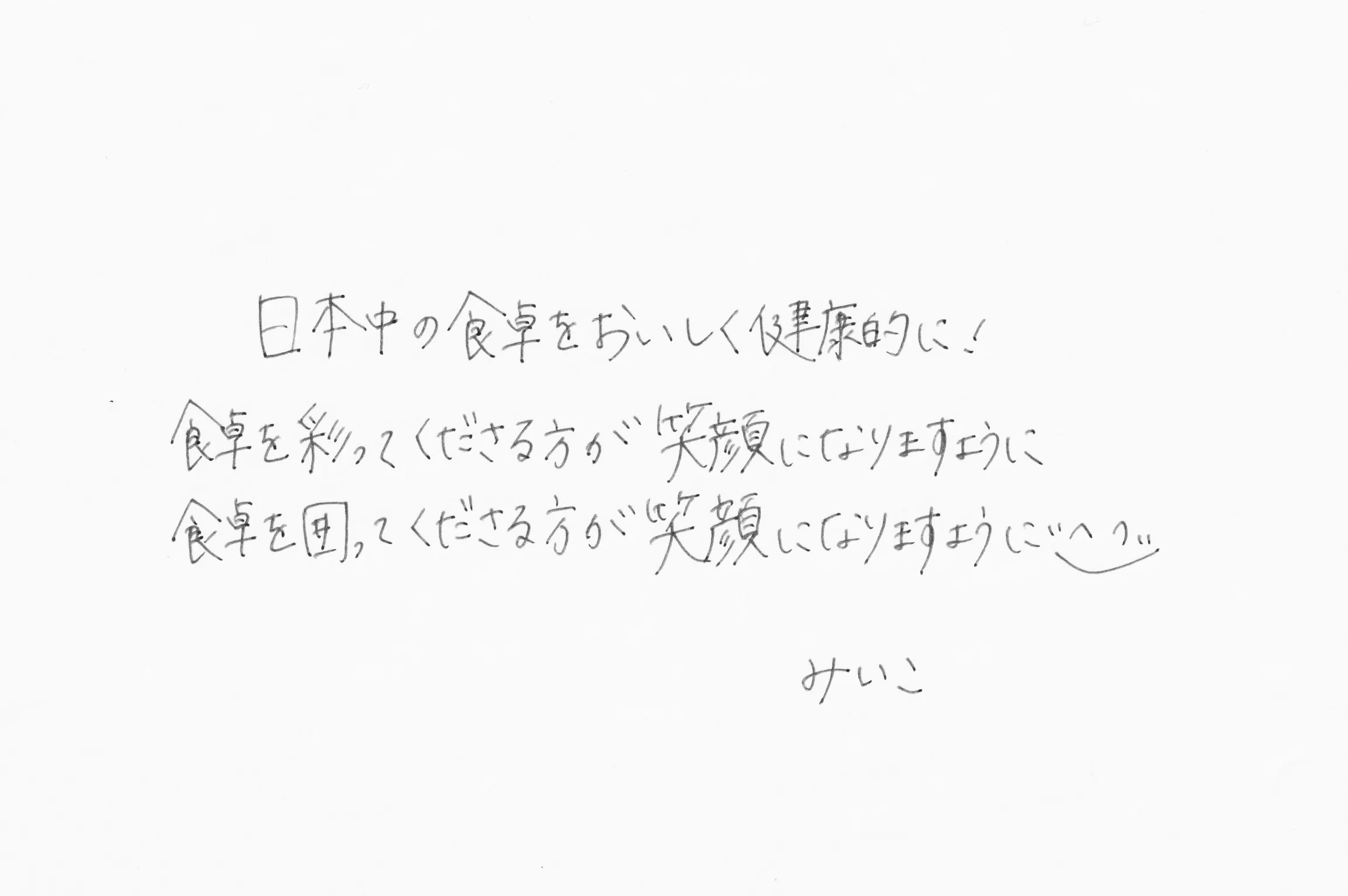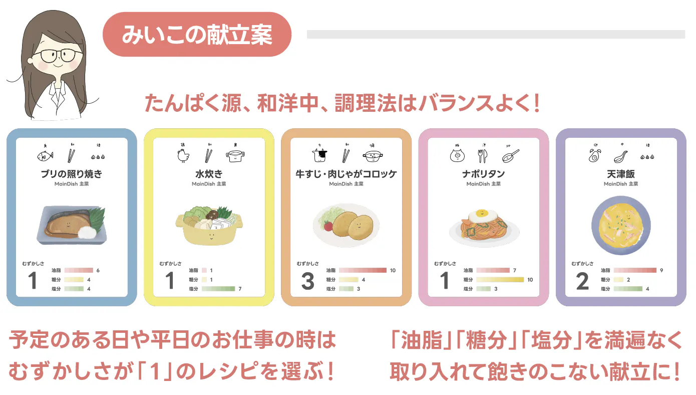 もっとより多くの方に『健康食を身近においしく楽しんでいただきたい!』と思い【おいしく健康的に続けられる献立】の入り口となる献立カードの作成にチャレンジしたいと思いました。