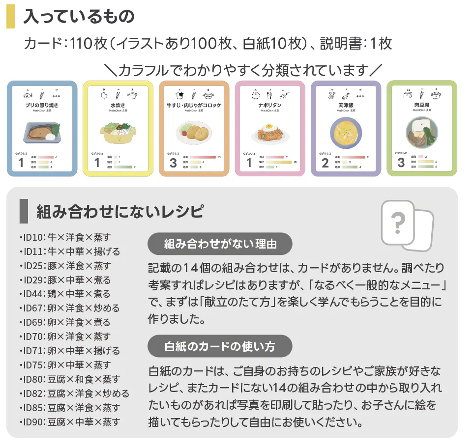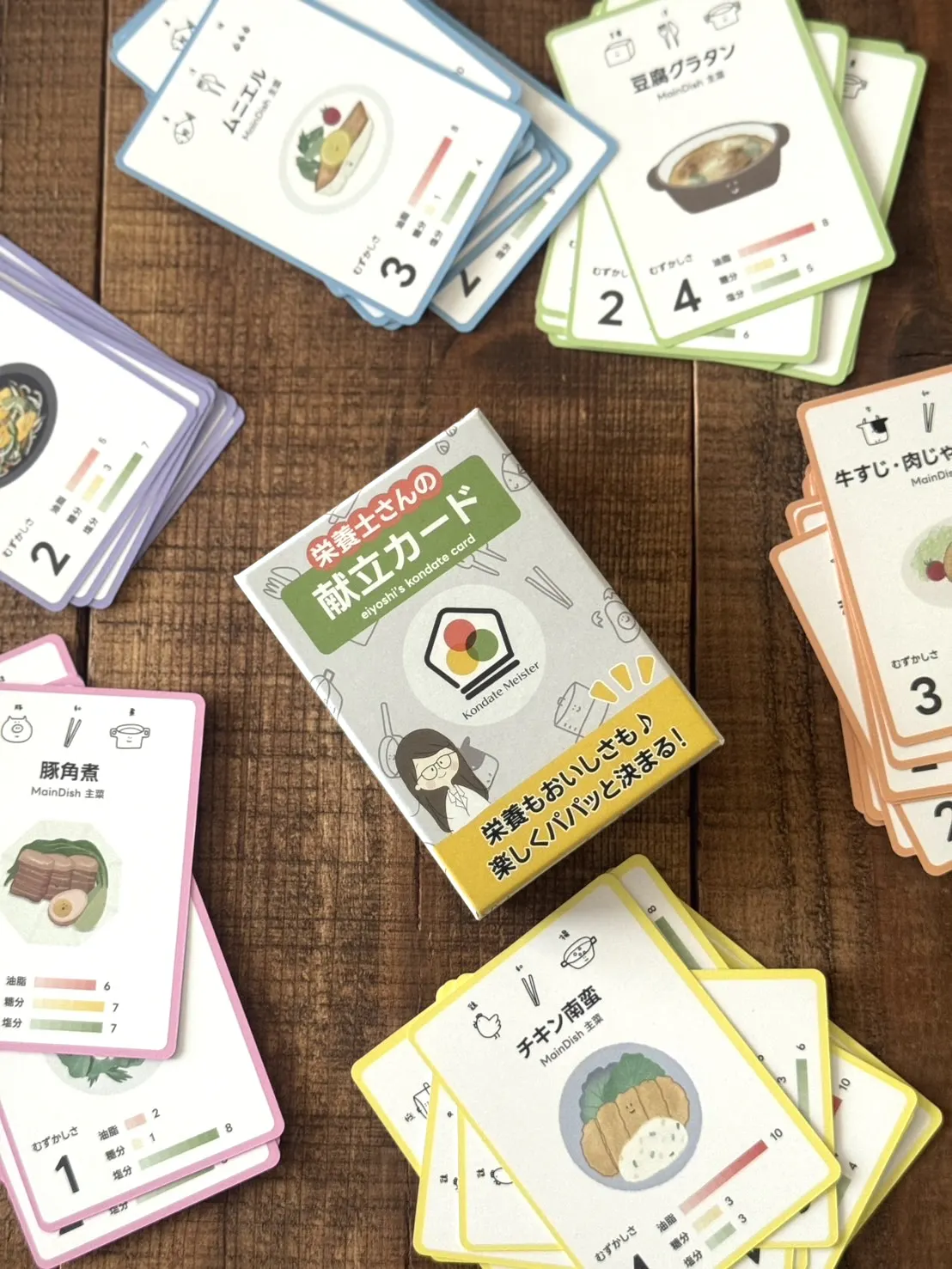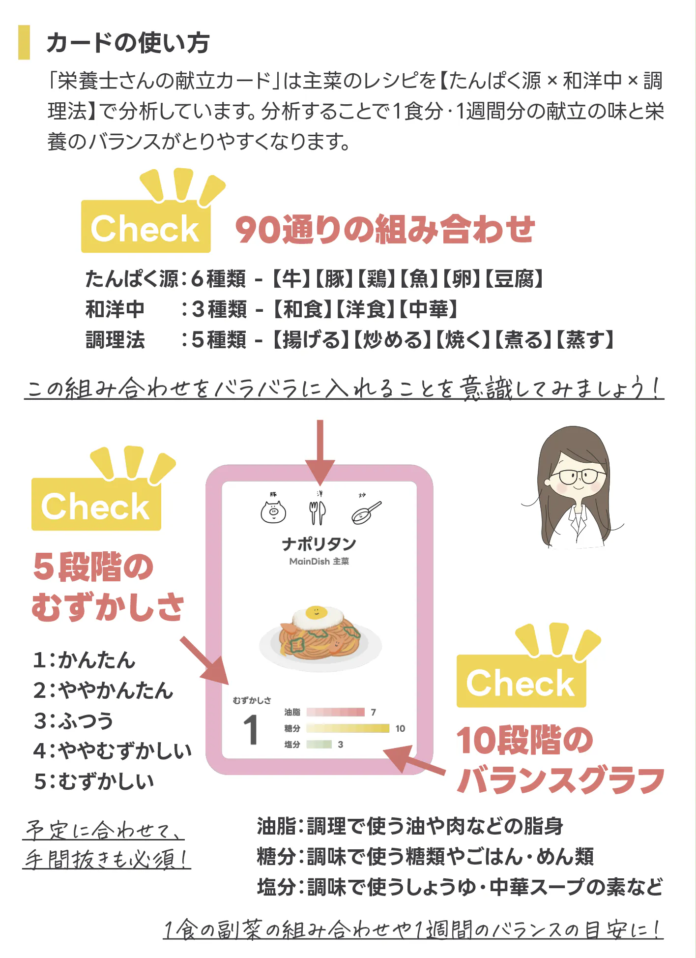 ひとつひとつのレシピを【たんぱく源×和洋中×調理法】の組み合わせで分類した献立カード。栄養だけでなく味のバランスもとれたメニュー選びがパパッとできてしまうというカードです。