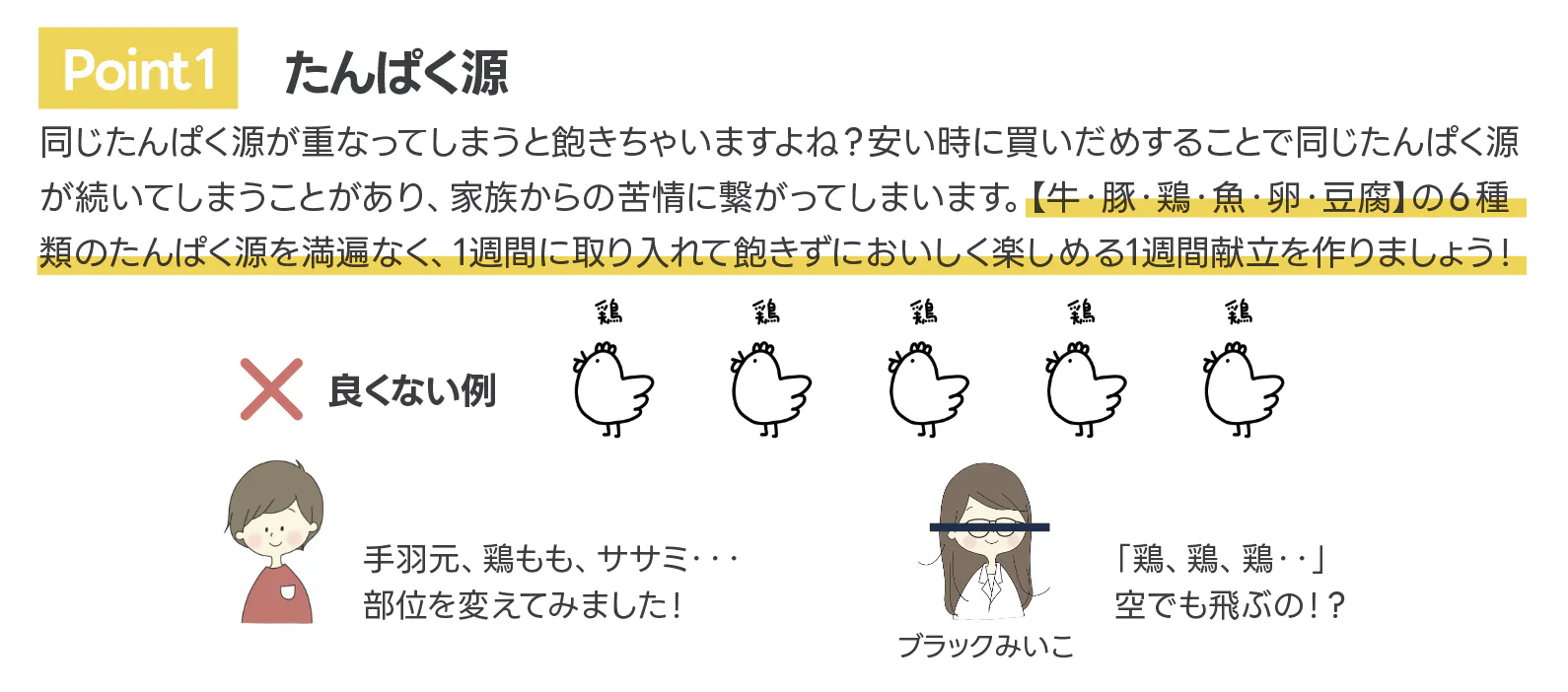 ①たんぱく源・・・重ならないように1週間献立に取り入れて家族の満足度を上げる