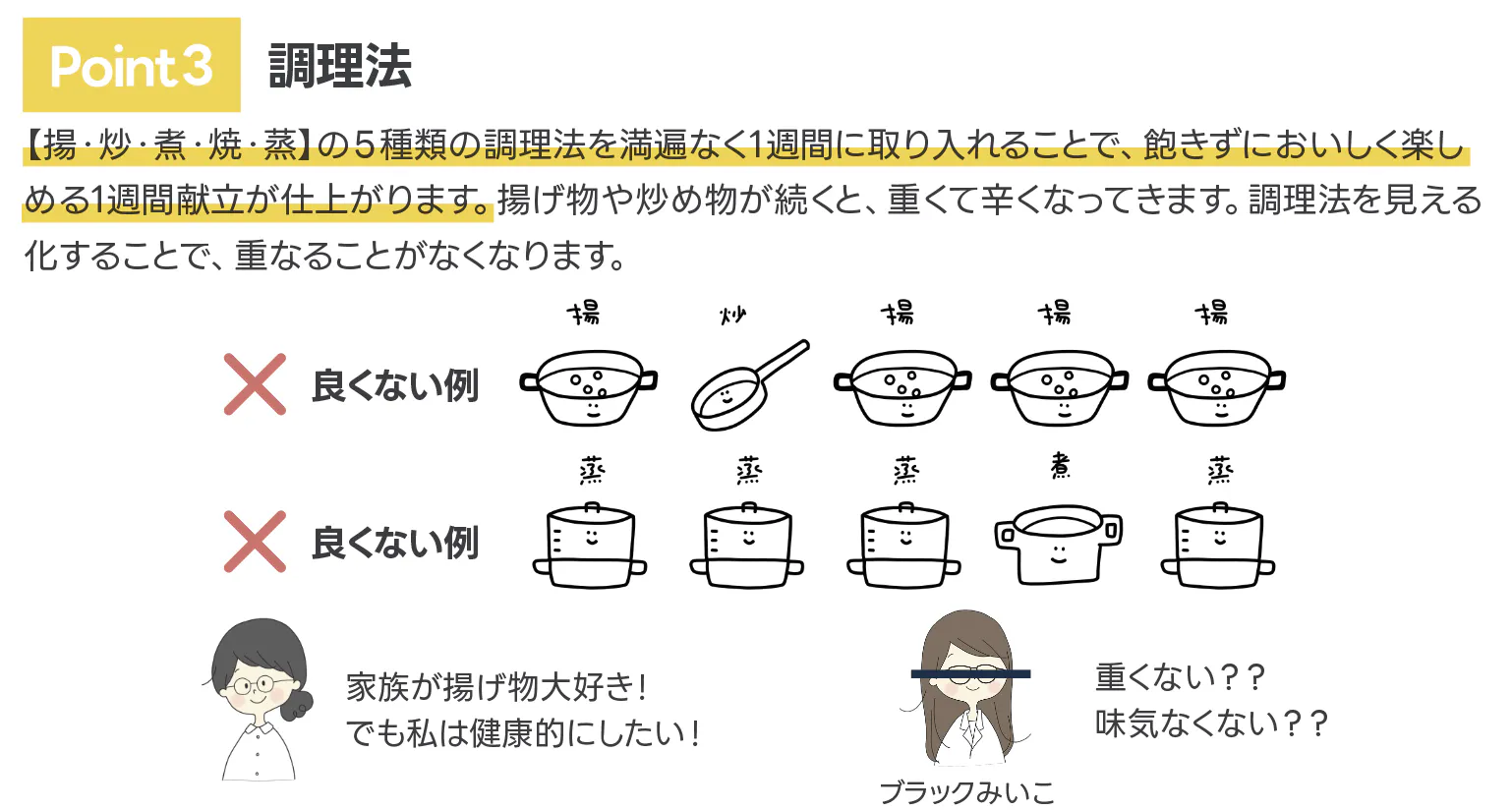 ③調理法・・・いろんな調理法を満遍なく選んで食べ飽きない健康献立を作る