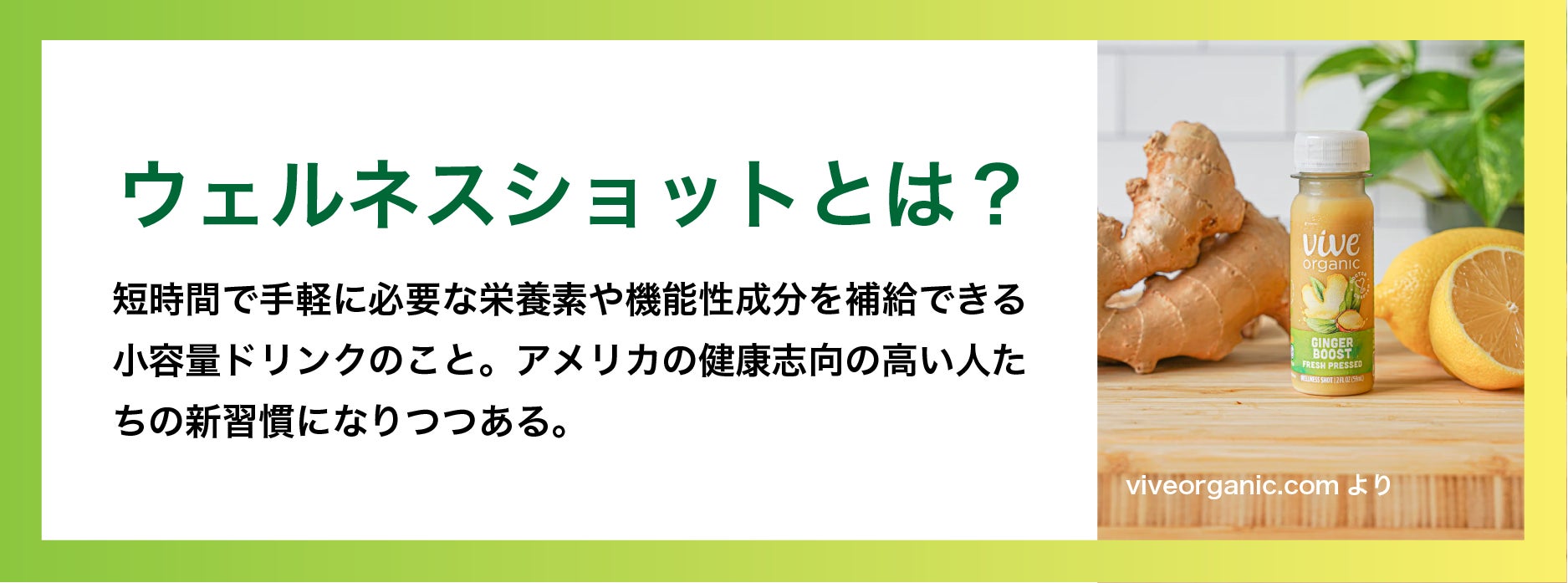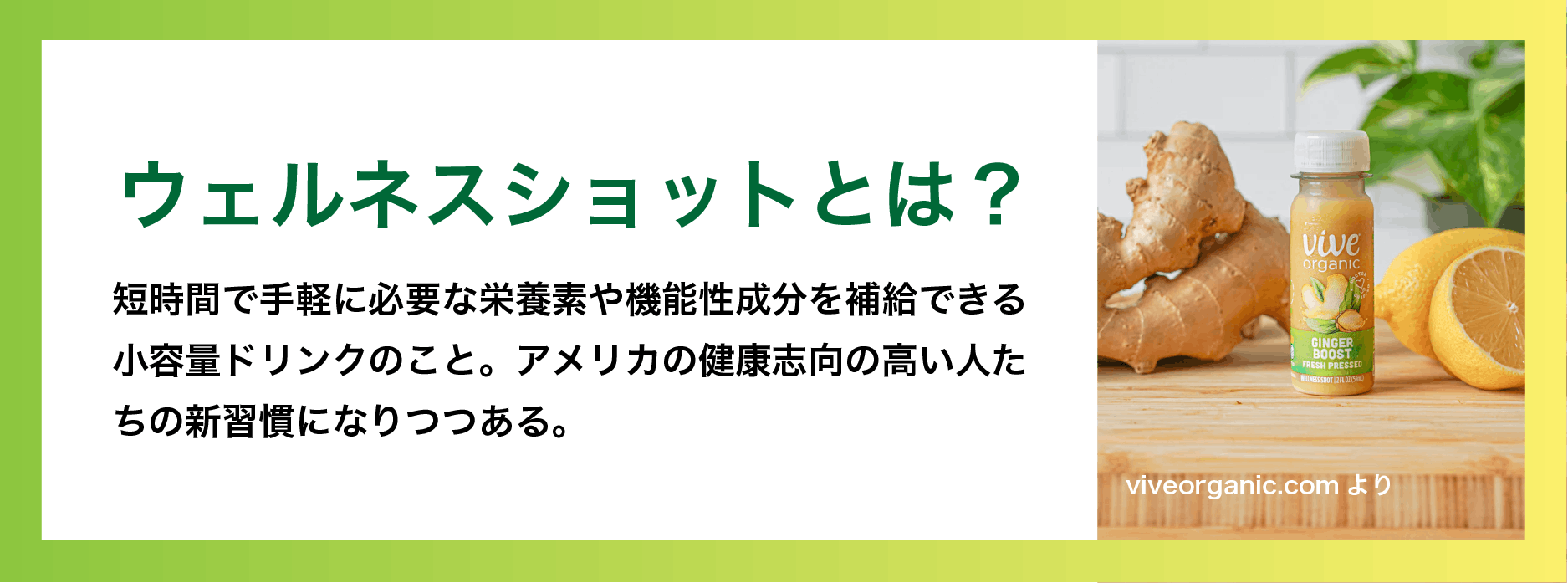 ウェルネスショットは、海外でも健康志向の高まりとともに注目されており、忙しい日常やスポーツシーンでも、ひと口ですばやく体調管理をサポートできるのが魅力です。