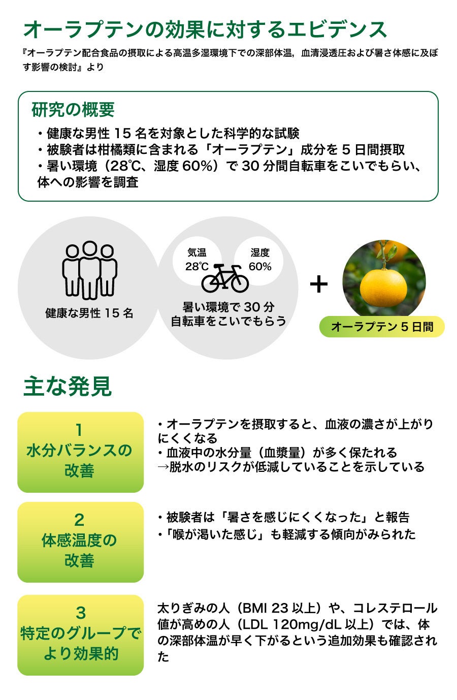論文:オーラプテン配合食品摂取による高温多湿環境下での深部体温、血清浸透圧および暑さ体感に及ぼす影響の検討