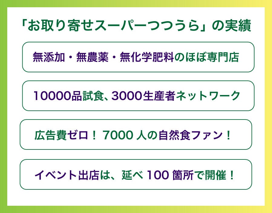 「良いものを作る生産者を守り、全国の人々に本当に良い食品を届ける!」私はこの使命を果たすために経営してきた制作会社を仲間に託し、一念発起して、全国の素晴らしい自然食品を集めて販売する「お取り寄せスーパーつつうら」を東京都豊島区にオープンしました。