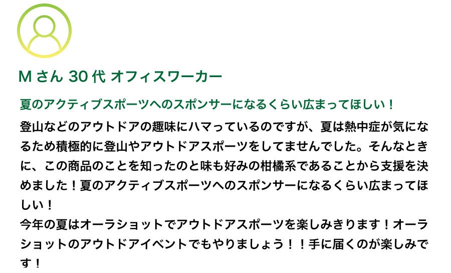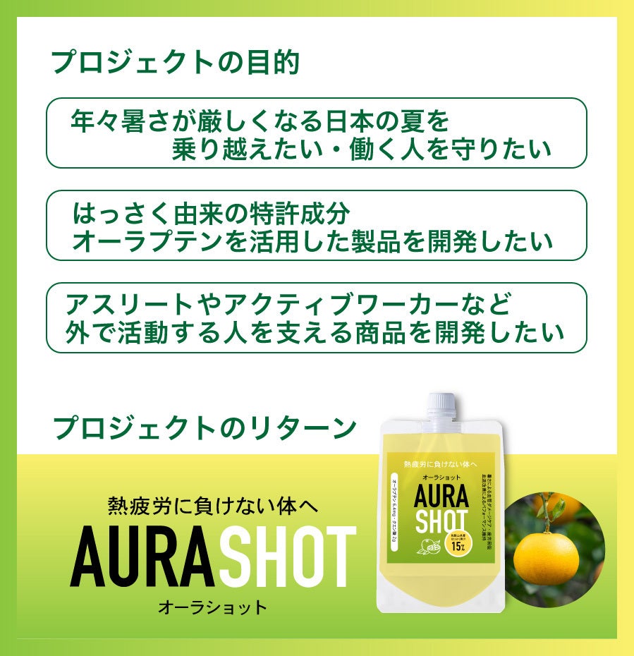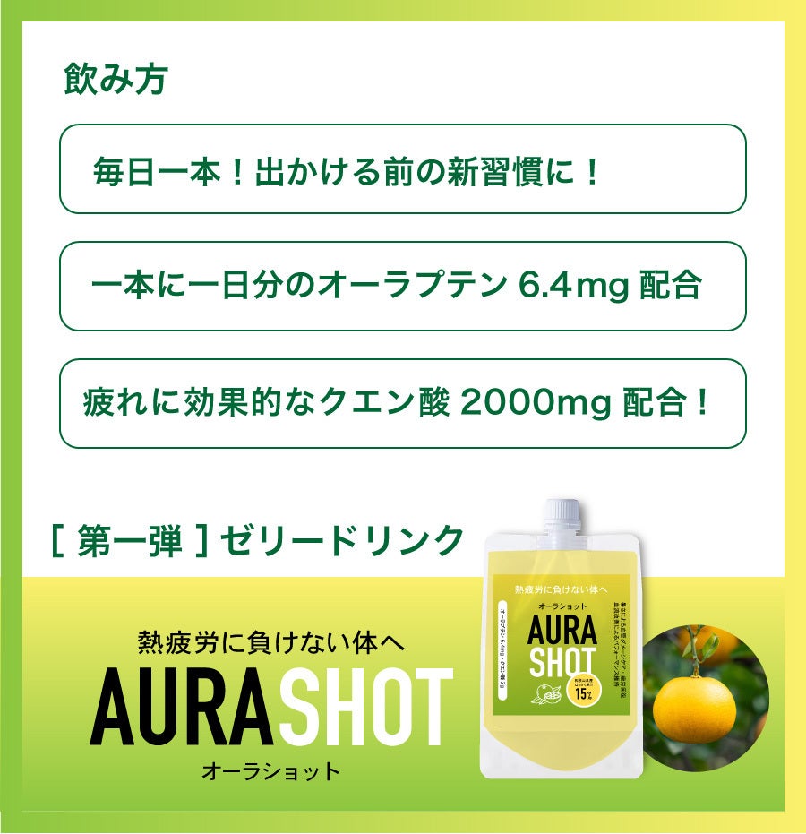 今回、皆様にご支援頂きたいのは、暑さが厳しい日本の夏をより健康的に、そしてアクティブに乗り切るために開発した「ウェルネスショット(ゼリー飲料タイプ)」です。日本の夏は、高温多湿で体温調節が追いつかなくなることが多いため、熱中症や疲労リスクが高まります。オーラショットは、そんな高温環境下での身体の負担を減らし、暑さによるダメージや夏バテをケアすることを目的に開発しました。