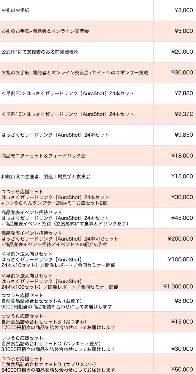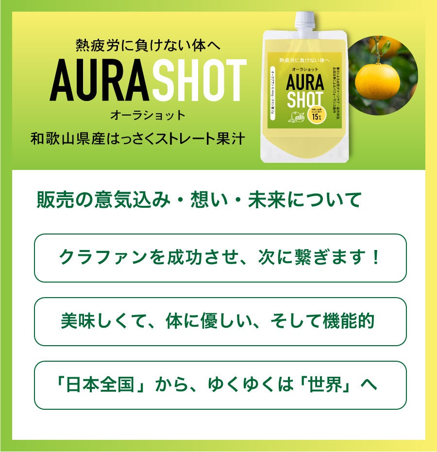 2025/04/29 14:51こんにちは!谷脇です(^-^)ついに!みなさんと一緒に育ててきた「AURA SHOT」が完成しました!【↓完成したAURA SHOTはこちら↓】今日まで応援してくださったあなたのおかげで、ここまでたどり着くことができました。本当にありがとうございます!成分に質問があったので、遅くなりましたが、掲載しておきます。添加物を極力減らし、和歌山県産のハッサクストレート果汁とピューレを15%も使っているので飲み心地はもうはっさくです!美味しいです!また甘みにもこだわりました。自然で体に優しい甘みをと、甜菜糖を使いました。カロリーも1つ飲んで78kcalとヘルシーですね!※色味は光の加減や加工により商品と異なることがあります。クラファン終了まで、いよいよあと1日となりました。ここから先も――「もっと多くの人にAURA SHOTを届けたい」「この想いを未来に繋げたい」そんな願いを叶える、最後の挑戦です。今後は、BtoB向けの専用サイトを立ち上げ、企業・団体への営業活動も本格化していく予定です。そのためにも、1円でも多くご支援を集めたいというのが、今の私の正直な気持ちです。もしご協力いただける場合は、こちらの画像を使っていただき、SNSでの拡散をお願いできないでしょうか?ご友人やご家族へのお声がけも、大きな力になります。\実は、クラファン価格は“めちゃめちゃ破格”なんです!!/最近のはっさく果汁の原料高騰などにより、正式販売時には価格を引き上げざるを得ない状況です。クラファン支援者の皆様には、今後も特別割引クーポンなどをご用意する予定ですが、現在のリターンが最もお得であることに間違いありません!中でも、【企業向けの100万円リターン】は圧倒的なコスパ。はっさくドリンク(24本入り)を100箱(計2400本)お届けする内容で、商品化後の価格で換算すると、実質120万~170万円相当になります。つまり、最大で70万円以上お得!正直…赤字覚悟です!24本セットの追加購入も是非です!かなりお得なので、買っておいて損はないです!なぜこの価格でご提供するのか?それは、企業様のPRや地域貢献活動にAURA SHOTを活用いただき、「多くの支援者に応援された商品だ!」「全国で注目されているドリンクだ!」というストーリーを一緒に作っていきたいからです。この商品の価値に共感していただける方には、きっと“今だからこそ”手に取っていただけると信じています。もし、周囲に企業様や市区町村、暑さ対策に関心のある業界の方がいらっしゃれば、ぜひこのラストチャンスをお伝えいただけると嬉しいです!なお、万が一クラファン終了に間に合わなかった場合でも、今月中にご連絡いただいた方には「クラファン価格」を適用いたします。\一緒に、ゴールを超えて未来へ!/以下に、告知用のテキストもご用意しました。お好きなものをご活用ください!------------------------------------------【最終日!応援お願いします】AURA SHOT(オーラショット)完成しました!無添加&国産はっさくの自然派ゼリードリンクで、今年の暑さに立ち向かう“新習慣”を届けたい!100万円のリターンは【実質170万円分】のめちゃめちゃ破格な特別セットもご用意。ほかのプランもすべて“今だけ価格”です。最後の一押し、ご協力いただけたら嬉しいです!▼プロジェクトはこちらhttps://camp-fire.jp/projects/827698/view------------------------------------------【クラファン価格が最安値です】・和歌山県産はっさく使用「AURA SHOT」完成・100万円リターン→170万円分相当・すべてのプランが市販価格より割安・食品・ノベルティ・法人利用にも対応健康意識・夏の暑さ対策には是非とも。ぜひこの機会にご検討ください。▼詳細はこちらhttps://camp-fire.jp/projects/827698/view------------------------------------------\シェア応援お願いします!/自然派の新商品「AURA SHOT」がついに完成国産はっさくの自然派ゼリードリンクで、今年の暑さに立ち向かう“新習慣”を届けたい!最終日、最後のひと押し、どうかよろしくお願いします!▼プロジェクトページhttps://camp-fire.jp/projects/827698/view------------------------------------------あなたの力が、未来を変える大きな一歩になります。最後まで、一緒に走らせてください!心から、感謝とともに。谷脇しのぶ もっと見る