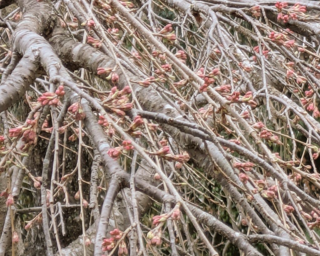 写真は今日のお昼に撮った、当館の中庭のしだれ桜のつぼみです。