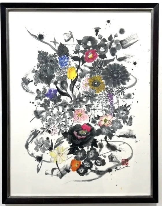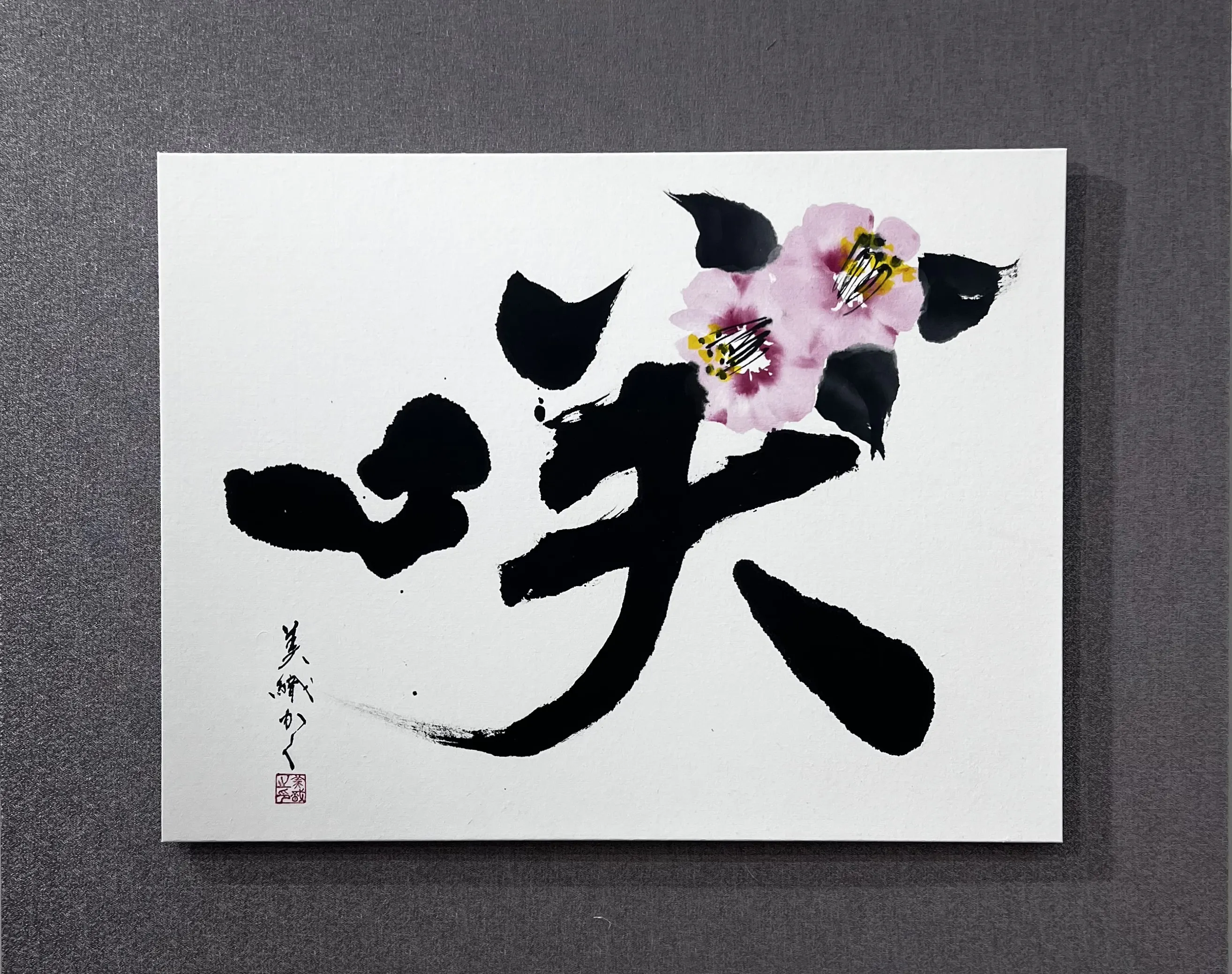 初めましての皆さんが聞いたこともない言葉が突然出てきましたね。華書®︎は、はなしょと読みます。心を華やかに彩る書、という意味で、私が作った言葉なので、読めないし知らないのは当然です。文字の中に墨(あるいは顔彩という和の絵の具のようなもの)で描いた花が咲いている作品のことをこう呼んでいます。(2021年に商標登録済み)