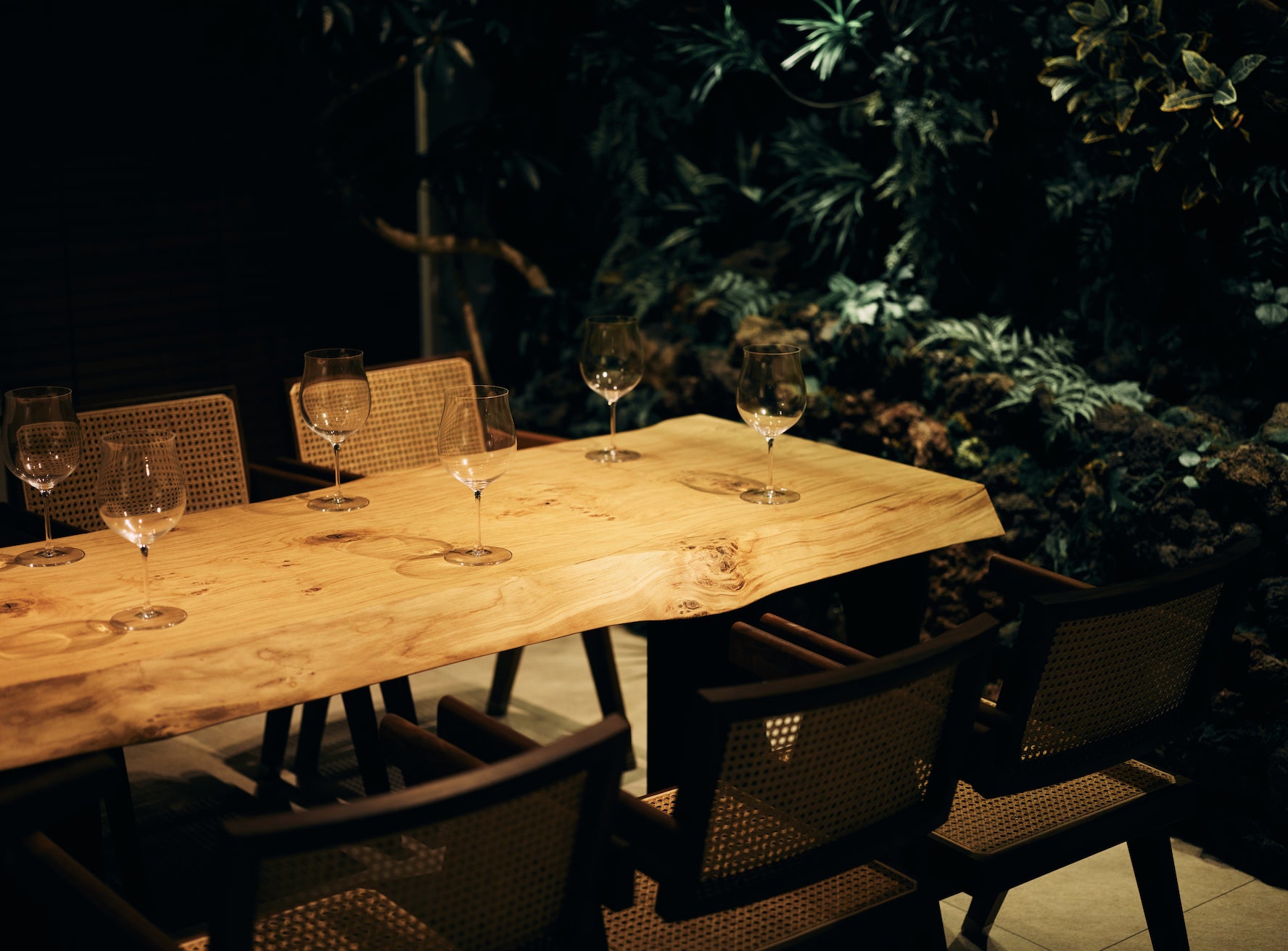最大12名利用可能なテーブル個室にはワイングラスやディスプレイの