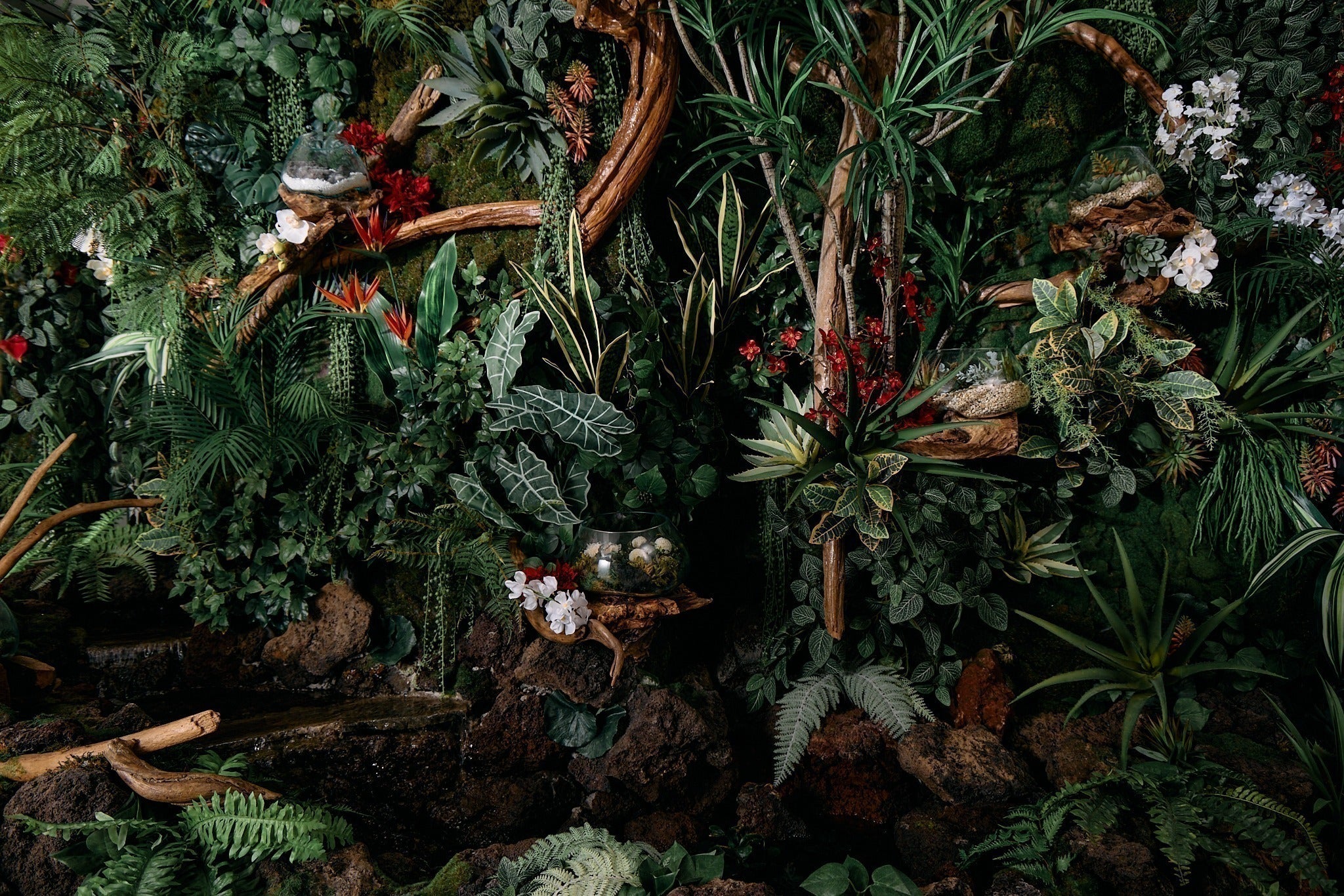 店内の壁一面に植物が茂っていて、季節毎にお花も変えています。