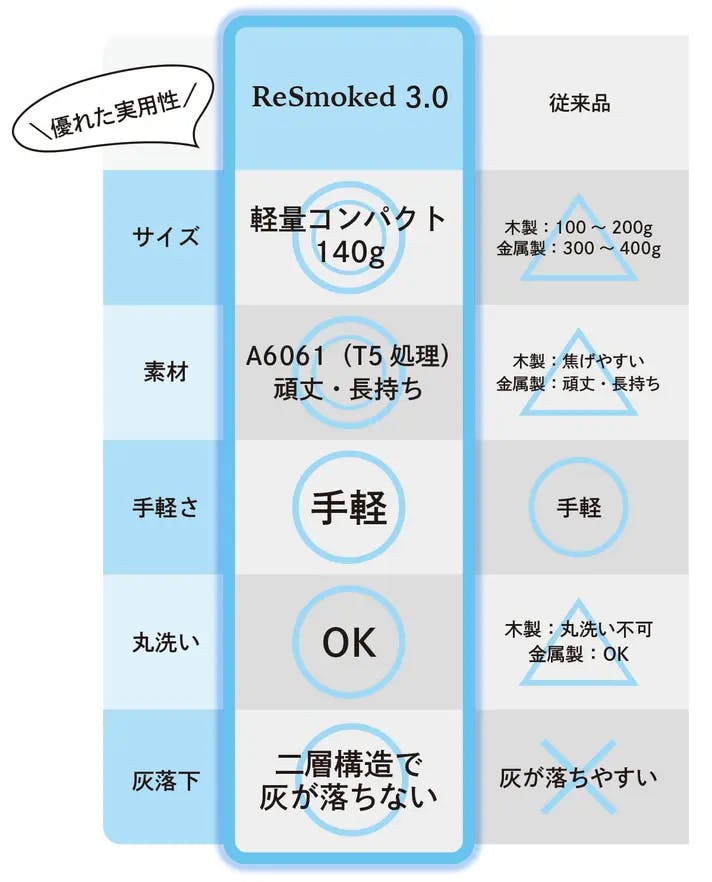 これまでの燻製器との違いはなんといっても140gの超軽量コンパクト設計。スマホの平均的な重さ200gよりも軽く、かさばらずに収納できる特徴があります。