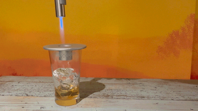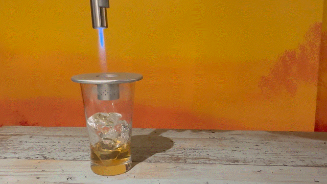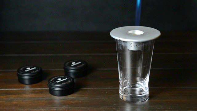 おうちのグラス上にスモーカーを置いて、木材チップを入れて、加熱するだけで本格的な燻製の香りを楽しめます。