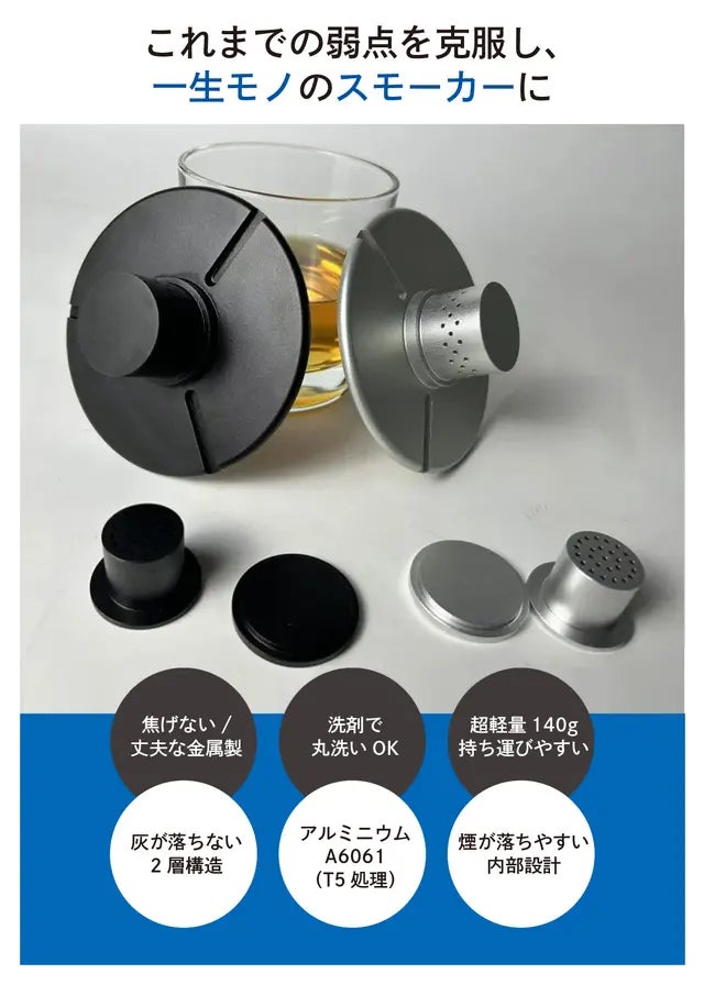 これまでのグラストップ型のスモーカーでは木製だと焦げ、丸洗いができなかったり、金属製だと300g~400gとなるため、重厚感からグラスにダメージが入りそう...とのお声がありました。