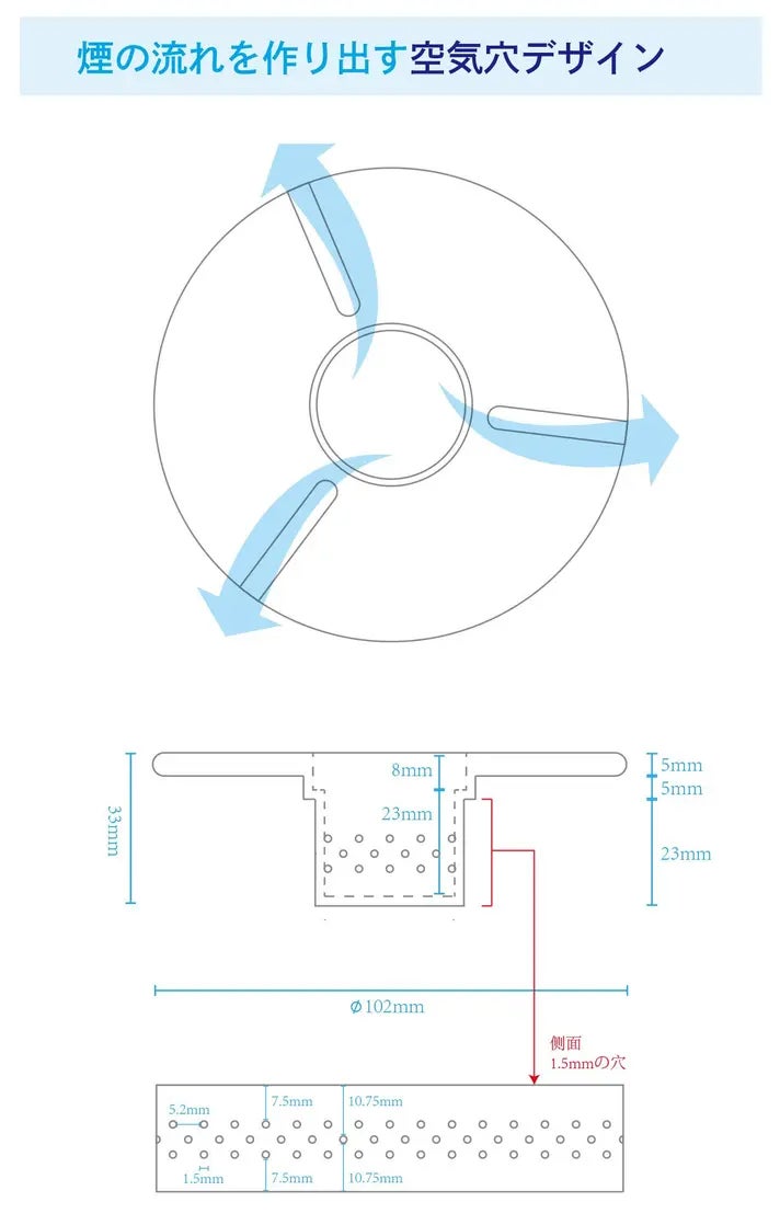 プロダクトデザイナーによる設計で本体の穴を最小1.5㎜まで縮小し、裏側に溝を設置することで2層でも煙の流れを作り出すように開発しています。
