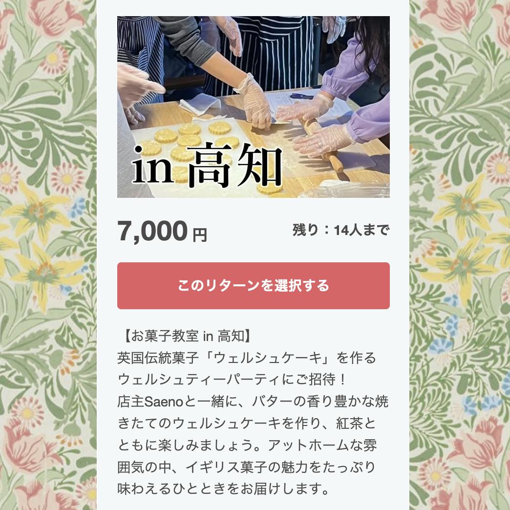 クラウドファンディングのリターンの一つである『お菓子教室 in 高知 / 東京』について、何人かの方からご質問をいただきましたので、ご案内させていただきます。