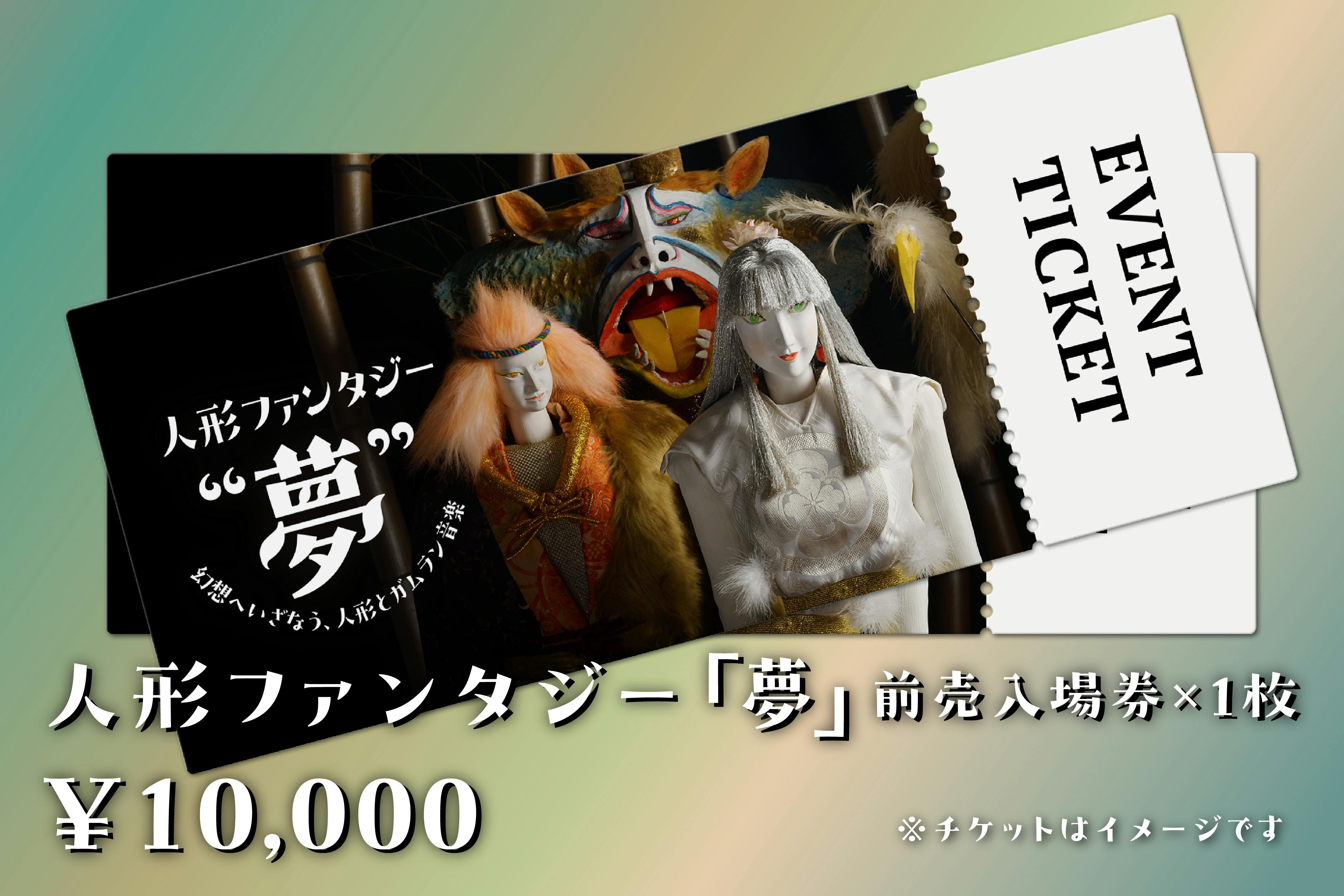 『人形ファンタジー 夢』の前売りチケットです。本チケットは、イベント運営へのご支援を含むものとなっております。前売りチケットを支援ご購入いただいた方を優先して座席をご用意いたします。チケットは4月中に発送を予定しておりますので、ご来場の際は必ずお持ちください。