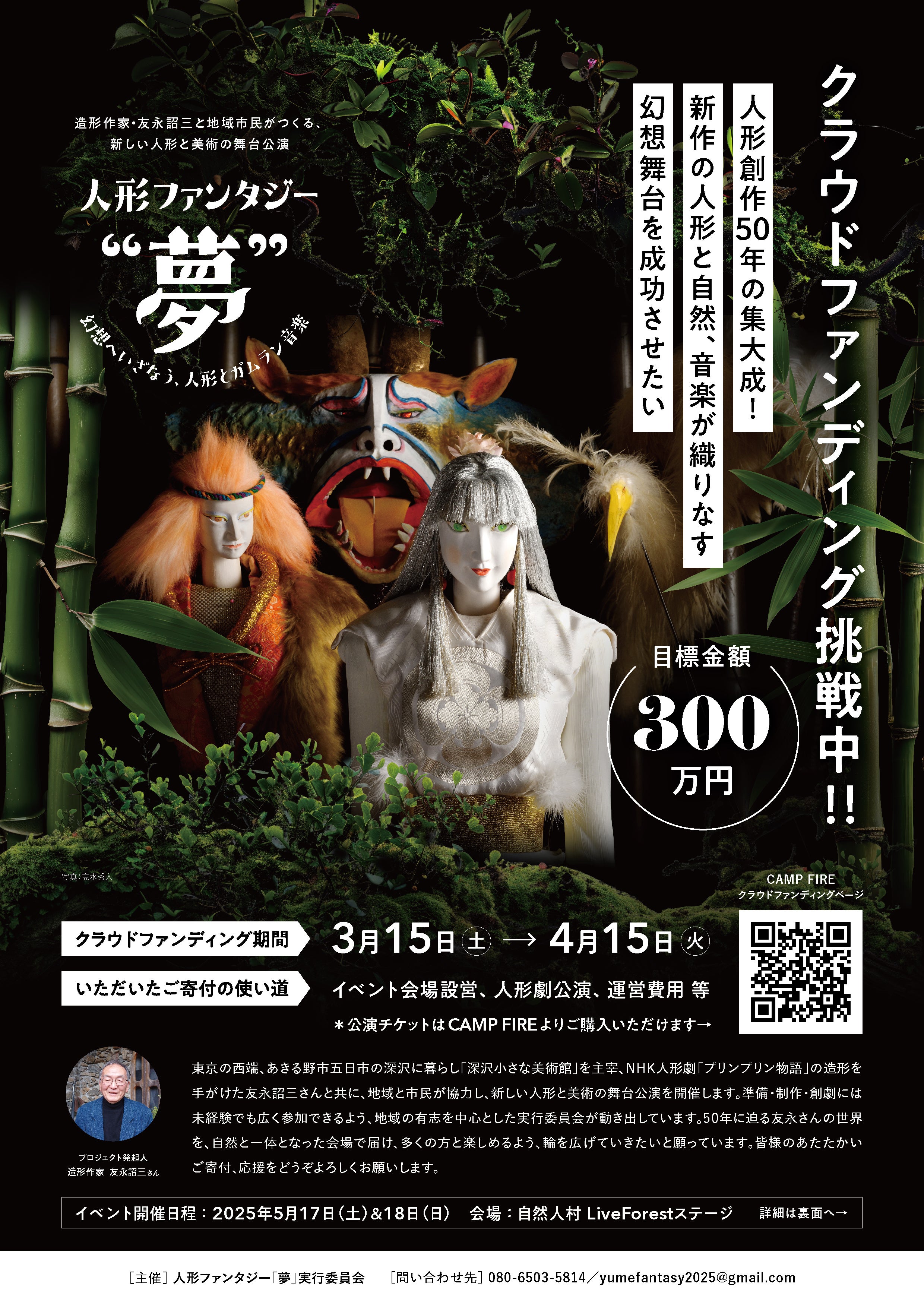 深沢やあきる野市の皆さんの協力のもと、手作りの人形舞台劇『人形ファンタジー“夢”』が実現します。ぜひご覧いただき、一緒に楽しんでいただけたら嬉しいです。ご支援・ご協力のほど、どうぞよろしくお願いいたします。