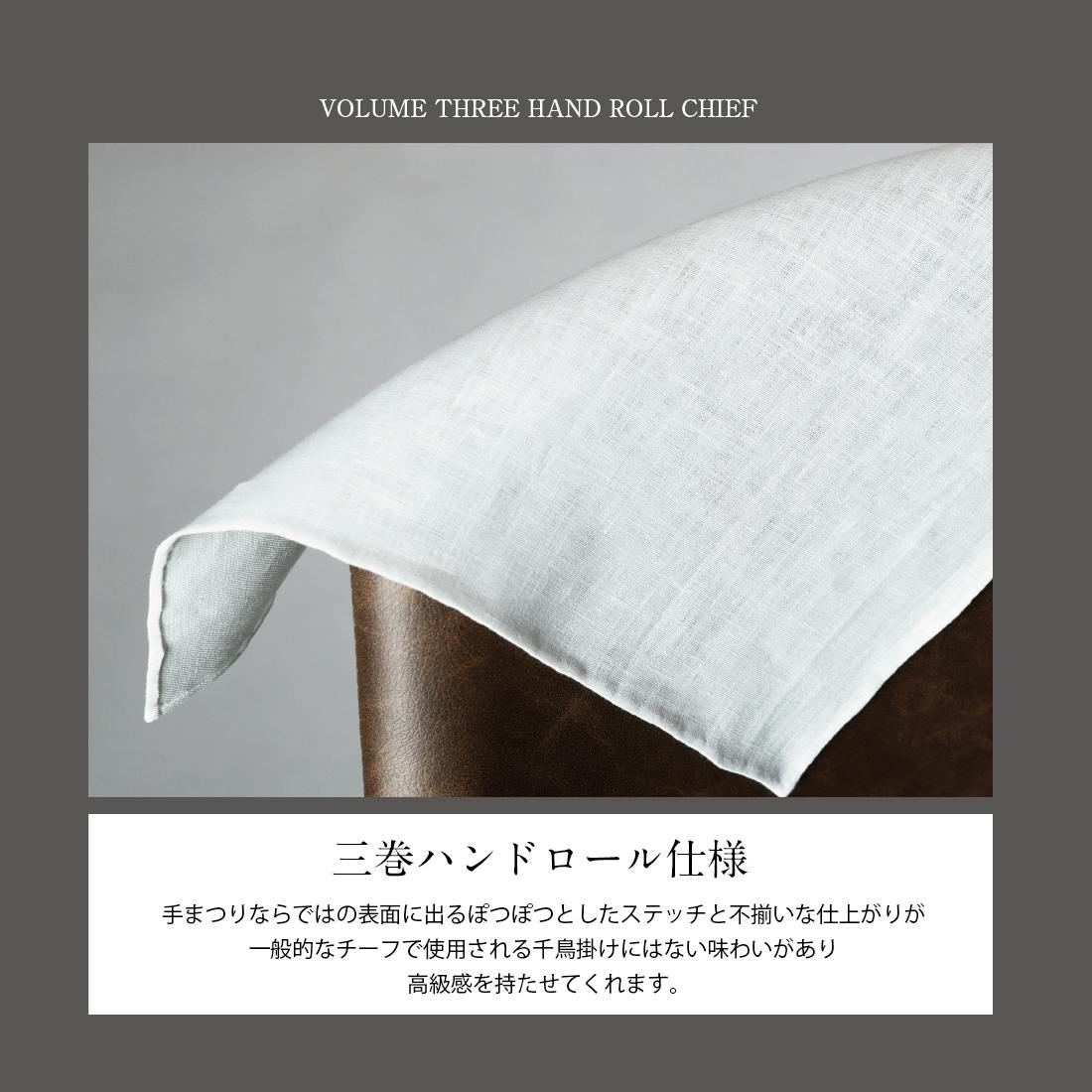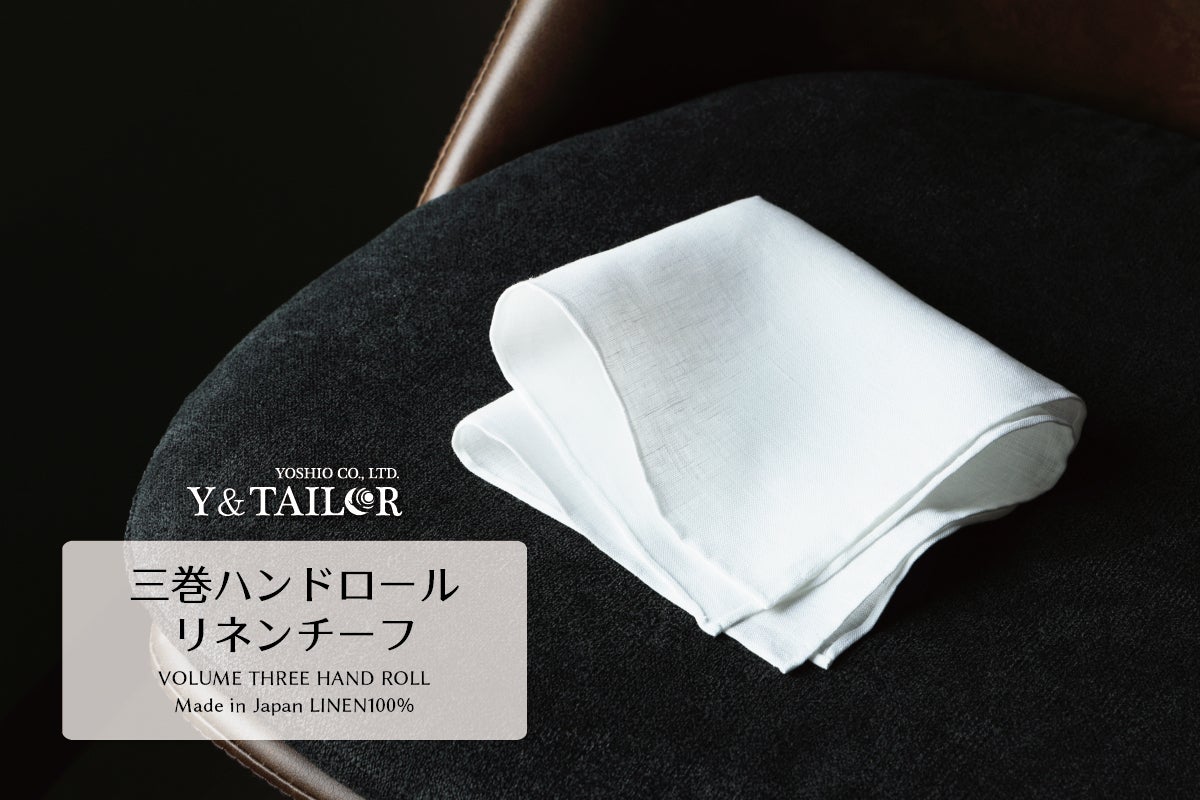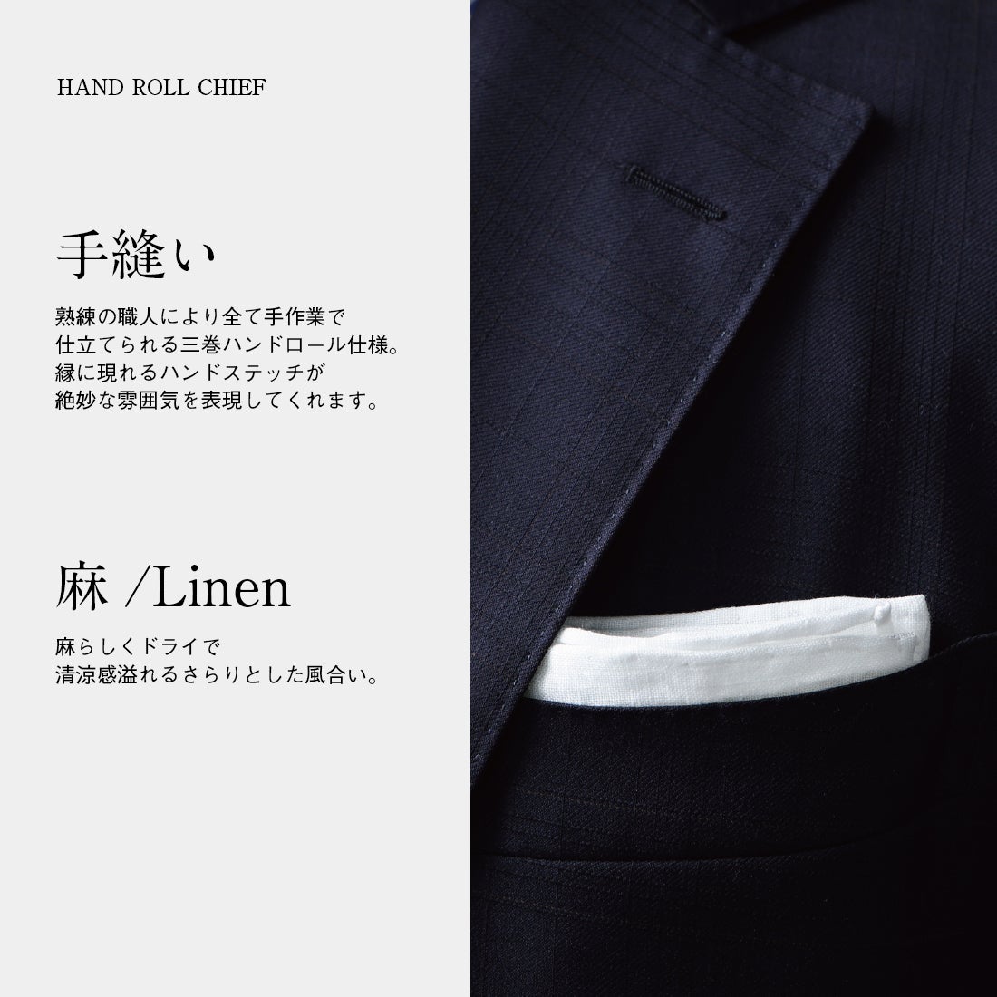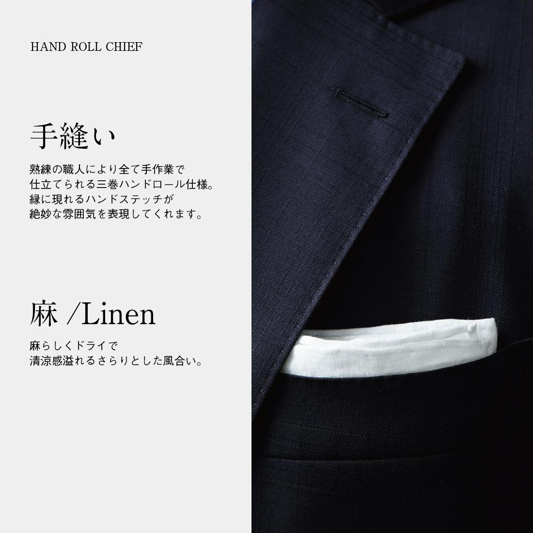 1枚はもっておきたい上質なリネン素材を使用した三巻ハンドロールチーフです。