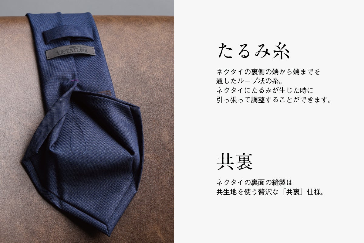 たるみ糸は、大剣と小剣の裏側から覗くループ状の糸です。これはネクタイの裏側を縫い合わせている糸の余り部分にあたります。縫い糸の先端に余裕をもたせることで、ネクタイを、締めたりほどいたりする時の無理な負荷を補助する役割があります。