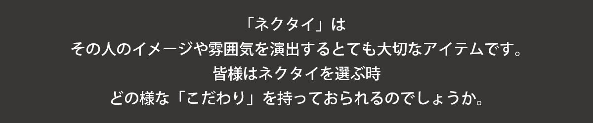 今まで有名ハイブランドや高級アパレルショップなど様々なネクタイを購入してきました。インポートネクタイで素材感は素晴らしいが長すぎてバランスが悪い…。反対に短すぎて小剣がネクタイ通しに届かない…。価格的にはリーズナブルで柄も好みだが素材感がイマイチ…。芯が頼りなくてディンプルが綺麗に作れない…。気に入るネクタイがあっても値段が高過ぎて購入出来ない。ショッピングに出かければ必ずと言っていいほどネクタイを購入し、「自分が本当に納得できる」ネクタイを探し求めてきました。