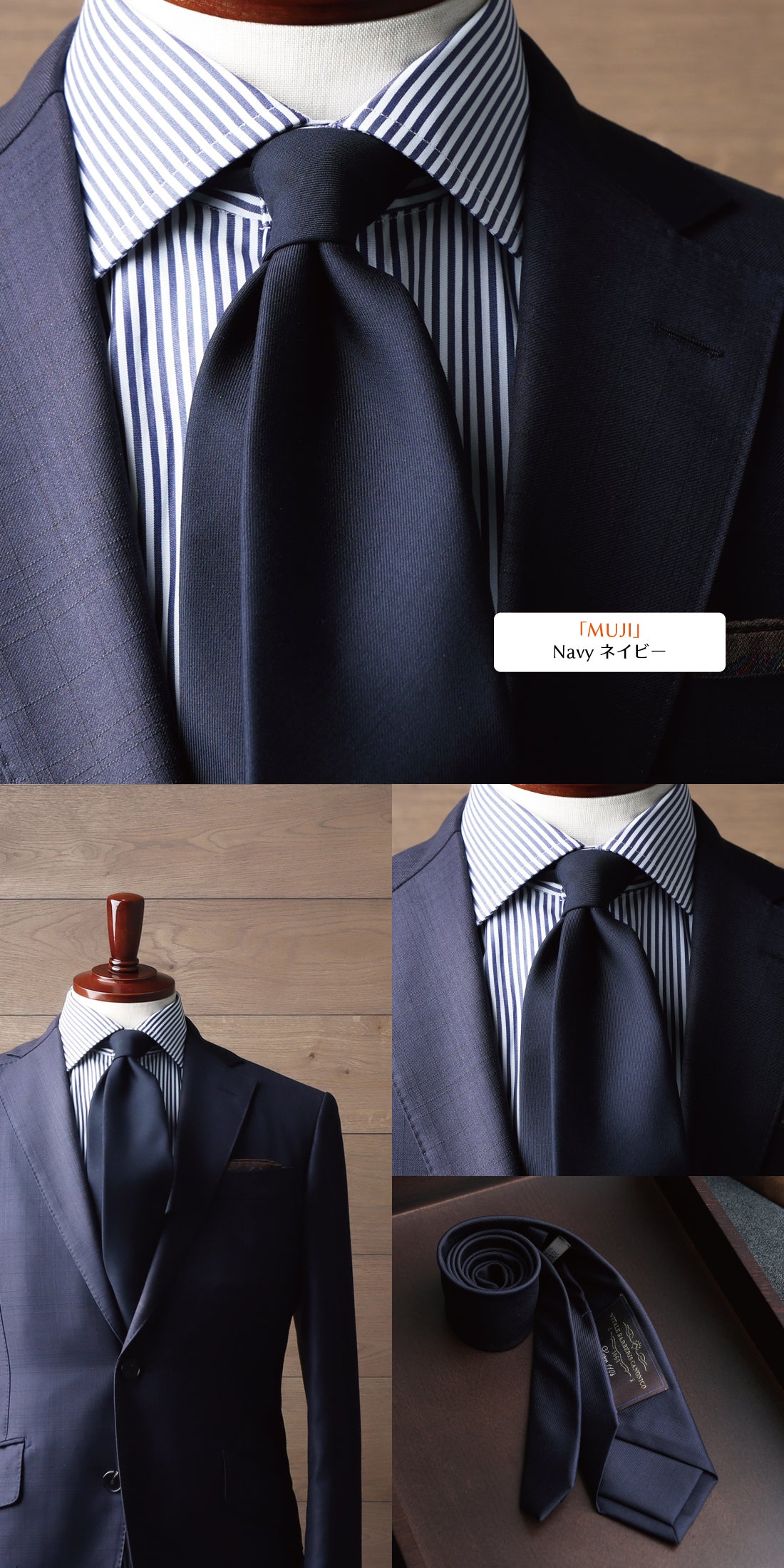 ネイビーのソリッドタイは、オールマイティに使えワードローブに揃えておきたい1本。スーツ・シャツ・ネクタイの同色系で3つのアイテムがよく馴染み信頼感と清潔感をイメージさせる男らしいコーディネイトを作ることができます。