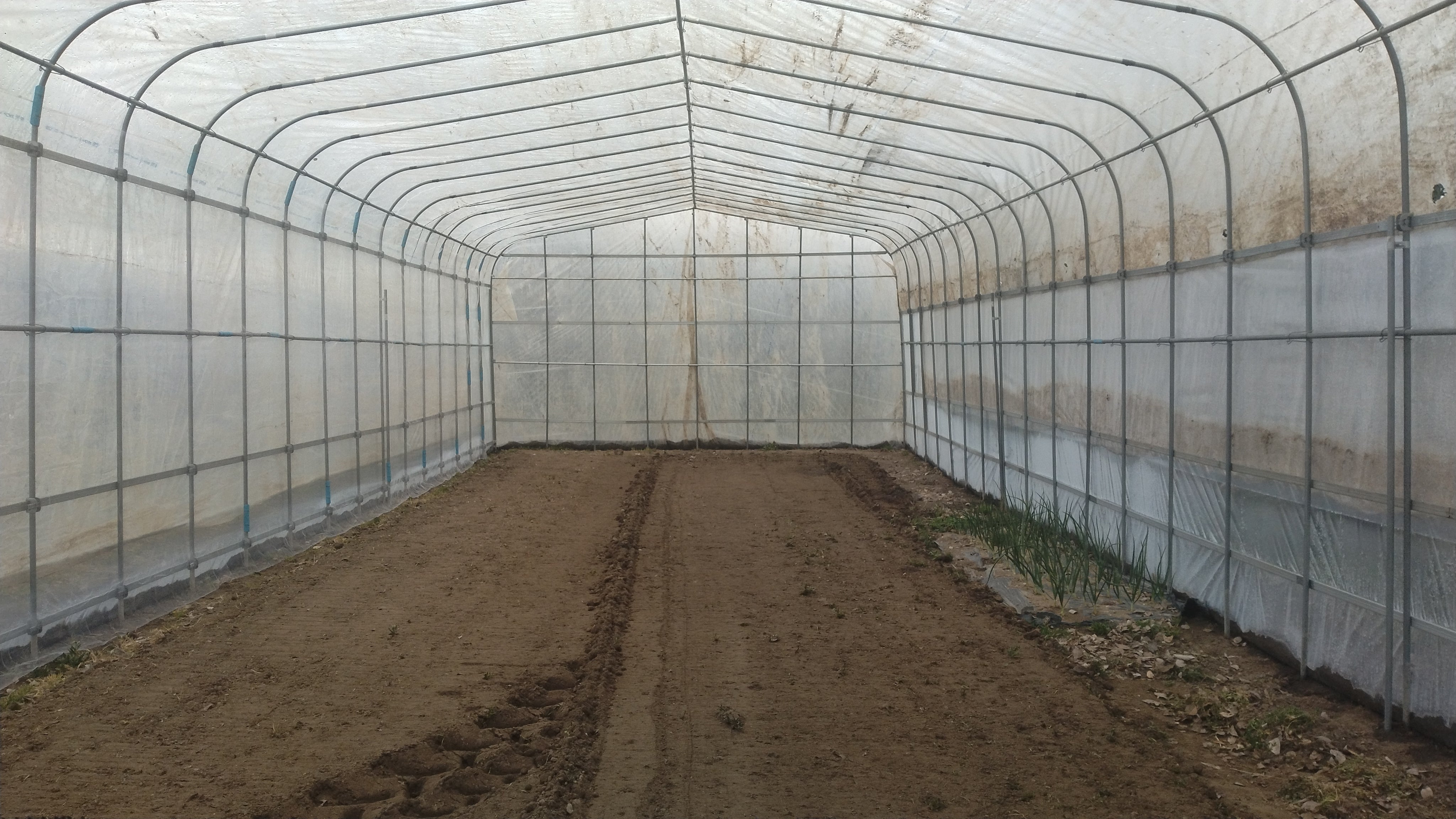 昨年に育苗ハウスで使っていたビニールを張ったので、少し白くなっていますが、なんとかなりました。