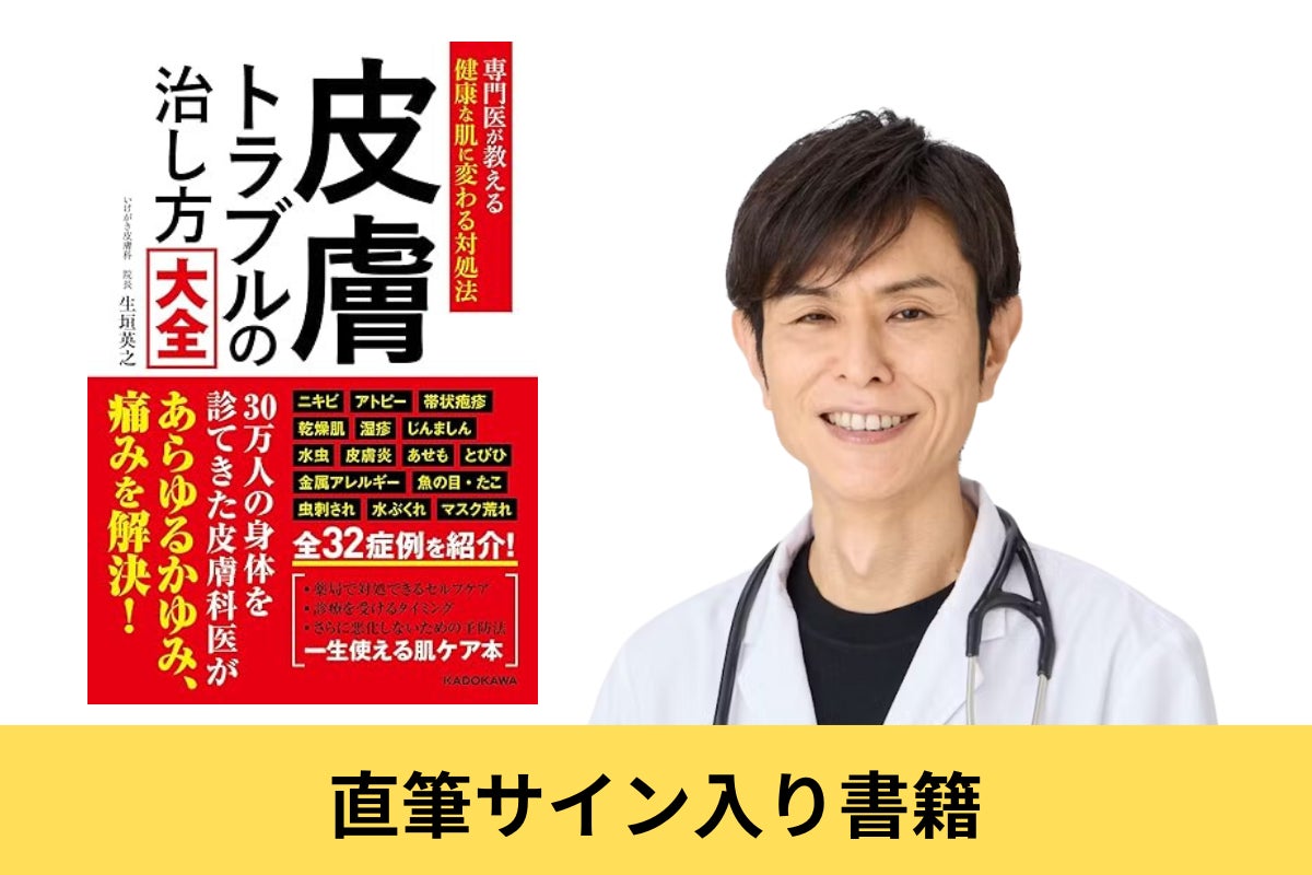 いけがき皮膚科の生垣英之による書籍「皮膚トラブルの治し方大全」を生垣の直筆サインとお礼のメッセージ付きでお送りさせていただきます。