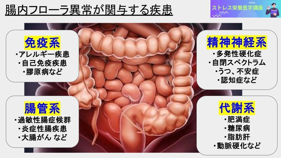 ストレス過多の状態は、栄養素の消耗により質的栄養失調を加速させるとともに、腸内では、腸内フローラ異常(ディスバイオシス)やリーキーガットを増悪させることが知られています。