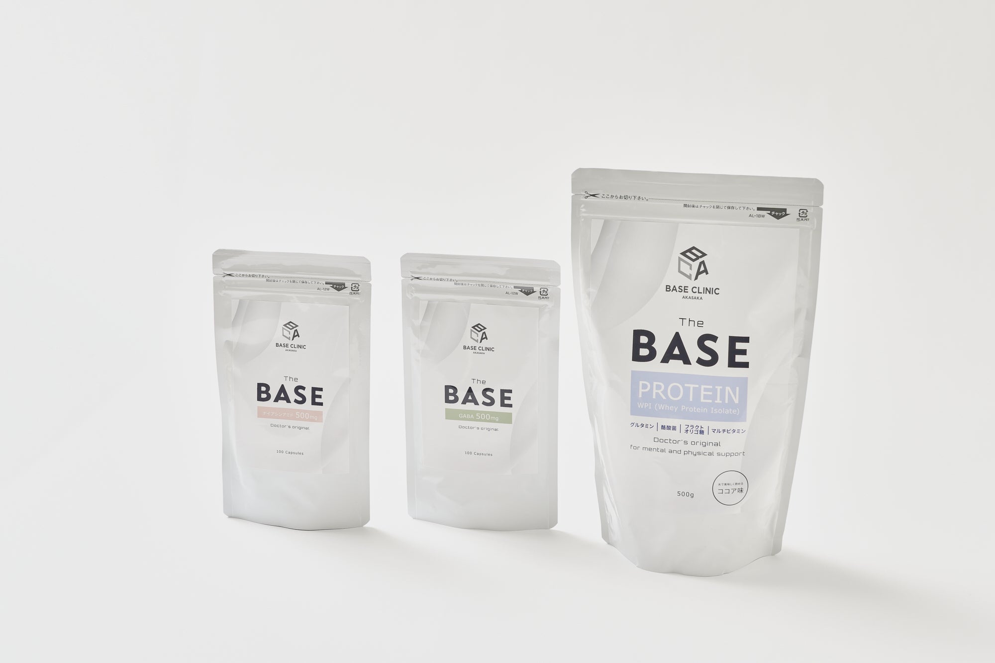 今回、プロテインに加え、ドクターズオリジナルブランド「THE BASE」の他のラインナップとして、「GABA」、「ナイアシンアミド」の2つのサプリメントをセットにしたプランもご用意しています。GABAは交感神経を鎮め、深い睡眠やリラックスに効果的で、ナイアシンアミドはアンチエイジング、抑うつの改善などに効果があると言われているサプリメントです。