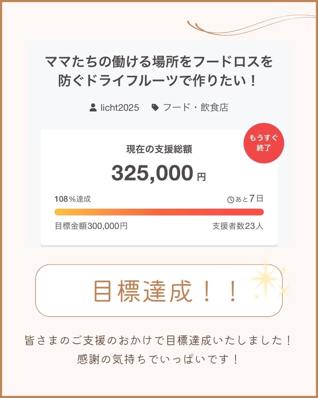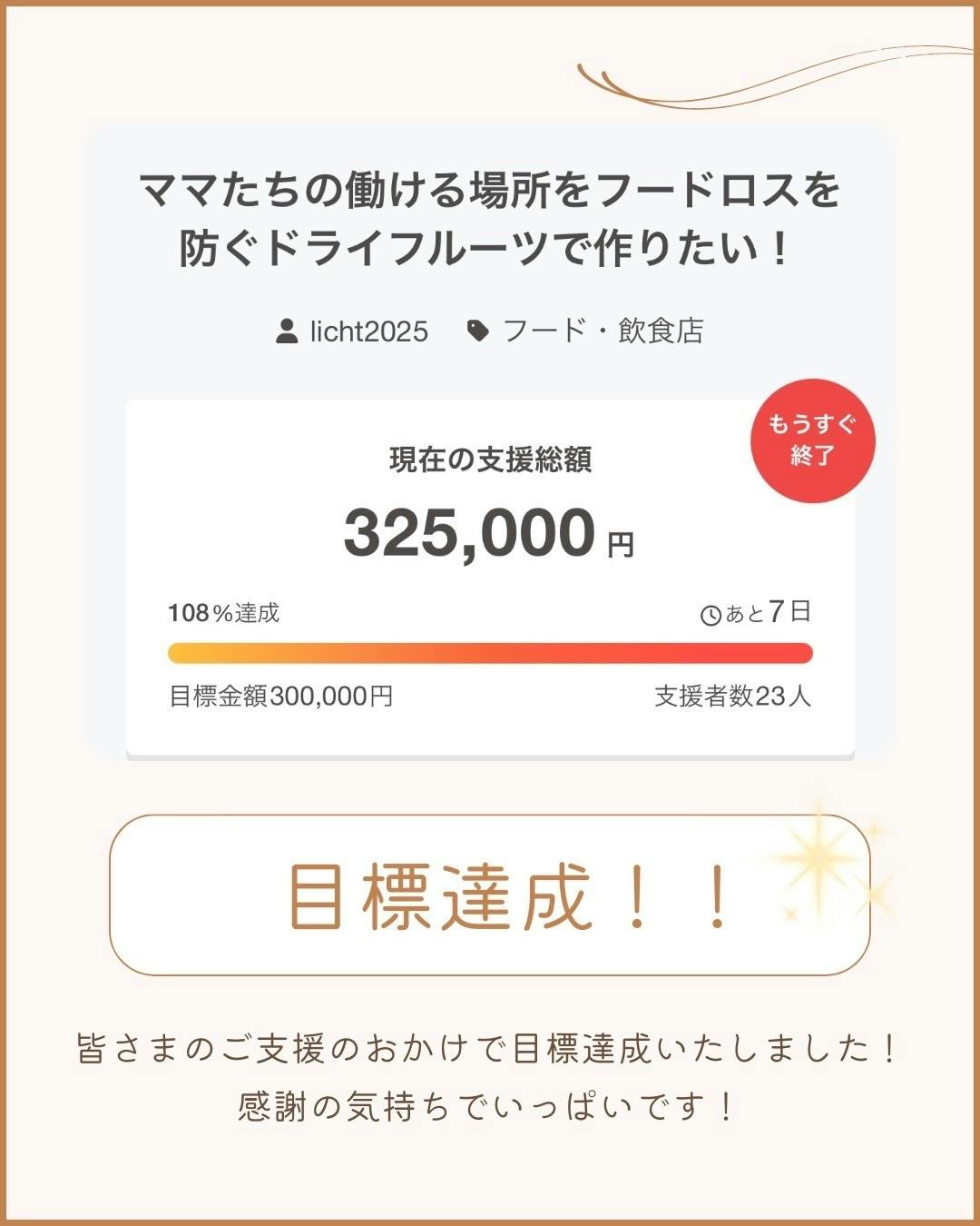 昨夜,目標達成致しましたΣ੧(❛□❛✿)沢山の方の温かなメッセージ、お返事ができておりませんがとっても嬉しく思っています。残すところ1週間ですが今以上を目指して頑張りますので応援最後までよろしくお願い致します!食べていただいた方も作っている私たちもみんなが笑顔で過ごせる‥そんな場所を作るためにぜひお力を貸して下さい♬最後までよろしくお願いいたします〜⭐︎