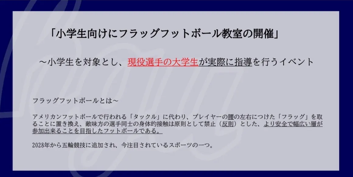 そこで弊部が持つソースを使って解決できないかと考えたものが、小学生向けにフラッグフットボール教室を開催する、というものです。