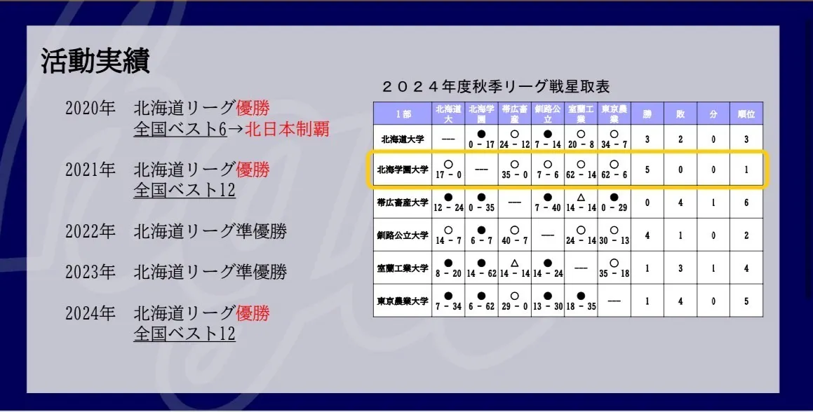 そこで昨年には徹底的に冬期間の練習、勧誘活動を見直し、同年には2年ぶりの北海道リーグ優勝、全国大会への出場を達成しました。が、同全国大会では中京大学に64-0と大敗を喫し、全国と北海道の差を痛感した一年となりました。