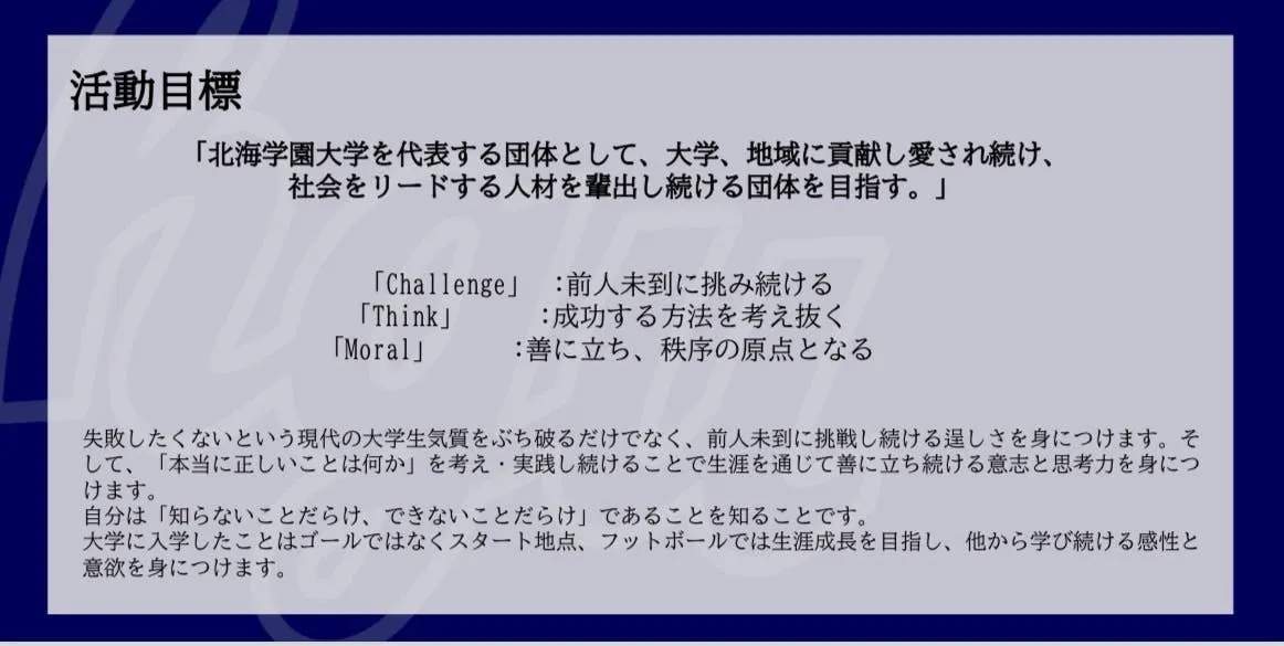 我々北海学園大学アメリカンフットボール部はフットボールという未経験のスポーツに取り組んでいく中で試行錯誤を繰り返し、挑戦し続ける貪欲さや思考力、チームワークやリーダーシップを養い、将来的に即戦力として社会に貢献できる人材として成長することも目的としています。
