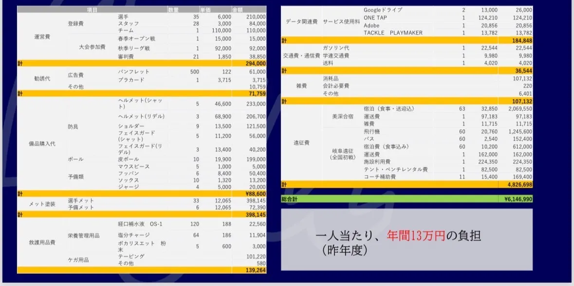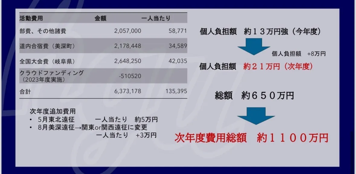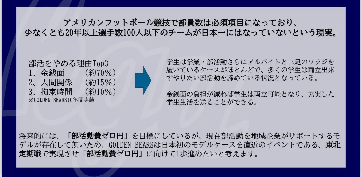 しかも挑戦を決意し熱意を持ち入部しても、約半数が退部,原因の約8割が金銭的理由で継続できないという現実があります。