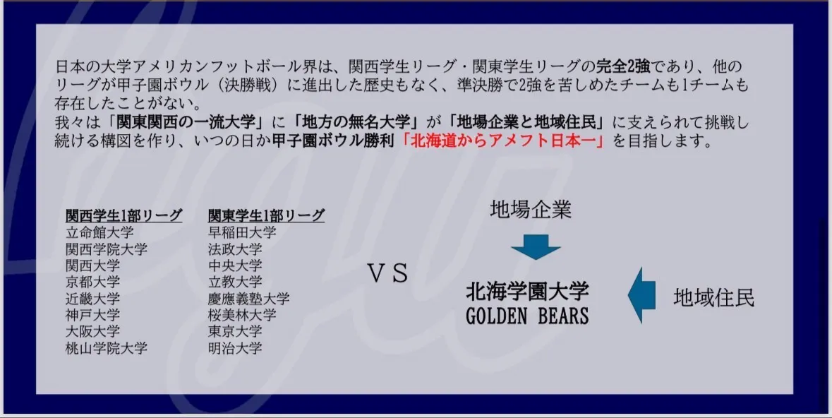 その現状を打破し、「地方の無名大学」が地場企業と地域住民に支えられて挑戦し続ける構図を作り、「北海道からアメフト日本」一を目指します。