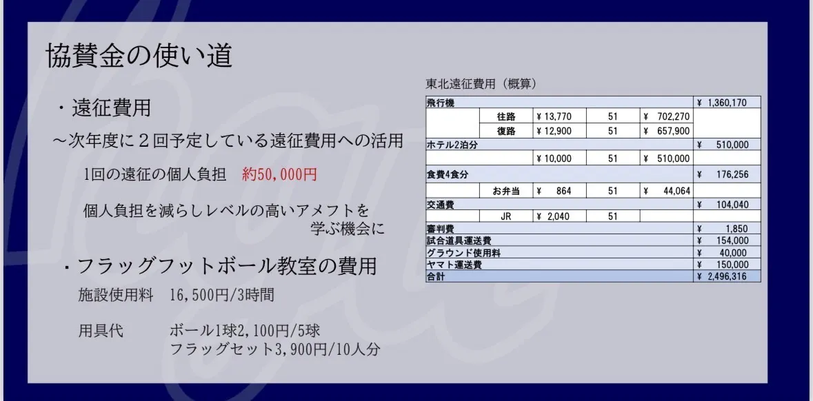 今回皆様からいただいた支援金は、今年度予定している遠征費用、今後のフラッグフットボール教室の開催費用として、大切に使用させていただきます