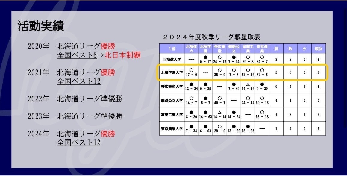 2020年に北海道リーグ優勝、40年ぶりとなる北日本優勝を果たし、2021年には北海道リーグ2連覇を成し遂げました。しかし続く2022年、2023年には北海道優勝を逃しました。