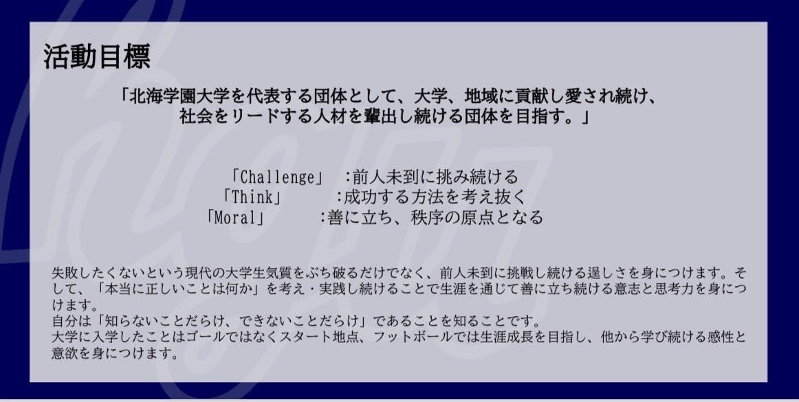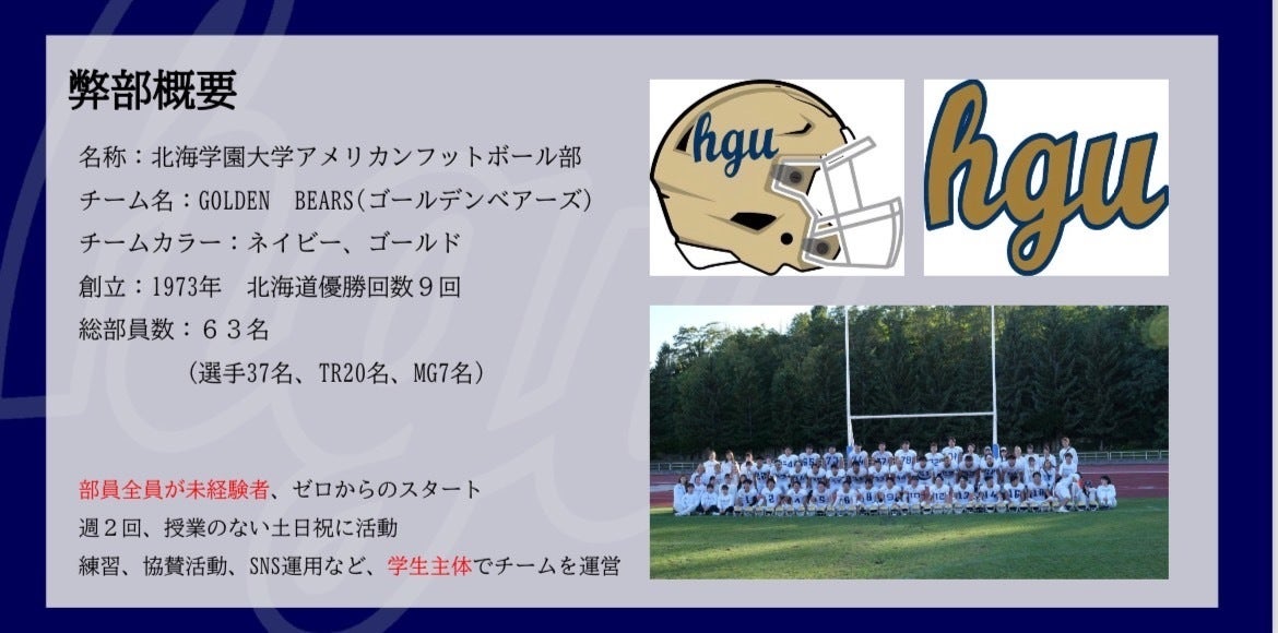 我々北海学園大学アメリカンフットボール部はフットボールという未経験のスポーツに取り組んでいく中で試行錯誤を繰り返し、挑戦し続ける貪欲さや思考力、チームワークやリーダーシップを養い、将来的に即戦力として社会に貢献できる人材として成長することも目的としています。