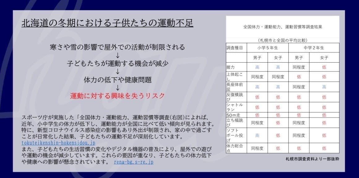 札幌市をはじめとする北国地方では、冬季における子どもたちの運動不足が深刻な社会問題となっています。