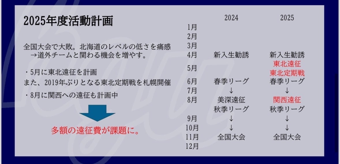 昨年度は全国大会に出場するも、初戦の中京大学に大敗。本州チームとのレベルの差を痛感しました。そこで今年度からは道外への遠征を積極的に行い、経験を積む方針で活動する予定です。