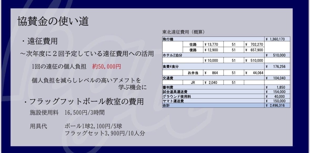 今回皆様からいただいた支援金は、今年度予定している遠征費用、今後のフラッグフットボール教室の開催費用として、大切に使用させていただきます